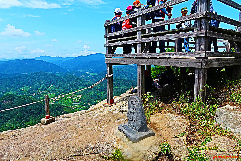 바위에 걸린 로프를 잡고 힘주어 오릅니다. 뒤돌아보이는 풍경이 정말 환상적입니다. 남쪽으로 섬진강 좌측에는 6년 전 올랐던 무량산(無量山 587m)이 포근한 모습으로 서 있습니다. 몇 차례 다리에 힘을 주니 드디어 용궐산 정상(647m)입니다. 정상은 넓은 너럭바위로 되어 있는데 조망데크가 설치되어 있고 아담한 정성표석도 놓여 있습니다.