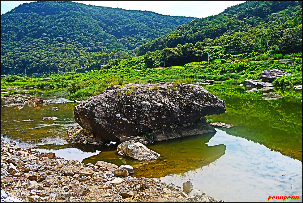 귀룡정 갈림길에서 내룡마을방향으로 직진합니다. 가파른 통나무계단을 내려서니 내룡재(장군목재)인데요. 여기서 요강바위(내룡마을) 이정표를 따라 도로를 걷습니다. 내룡경노당을 지나 섬진강변의 장군목 토종가든에서 우측으로 조금 가면 좌측 강바닥 기암이 널브러진 곳에 문제의 요강바위가 있습니다. 요강바위는 생김새가 요강처럼 생겨 부르는 바위로 높이 2m, 폭 3m, 무게가 자그마치 15톤에 이르는 큰 바위입니다. 장군목이라고 불리는 이곳 강바닥의 암석에 이처럼 진귀한 구멍을 만든 자연의 힘에 그저 감탄할 따름이지요. 6.25 한국전쟁 때 빨치산 다섯 명이 토벌대를 피해 요강바위 속에 몸을 숨겨 목숨을 건졌다는 일화가 있으며 아이를 낳지 못하거나 딸만 낳은 아낙들이 요강바위에 걸터앉아 구멍을 향해 소변을 보면 아들을 얻을 수 있다는 이야기가 전해 내려오는 곳이기도 합니다.