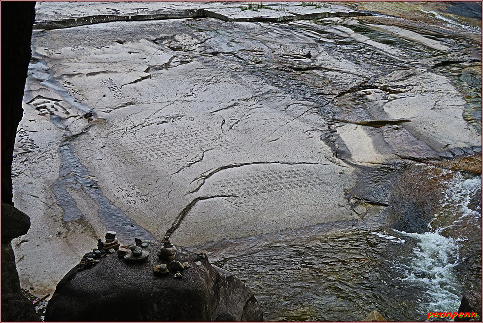 쌍폭포 위쪽에는 용추폭포가 있는데, 용추폭포는 상폭, 중폭, 하폭의 3단폭포로 구성되어 있습니다. 하폭 앞 바위에는 암각서가 있더군요. 우리는 하폭만 카메라에 담고는 다음 목적지인 두타산 협곡 마천루답사를 시작합니다.(2021. 8. 29)