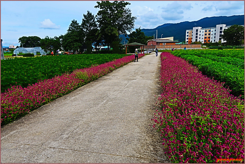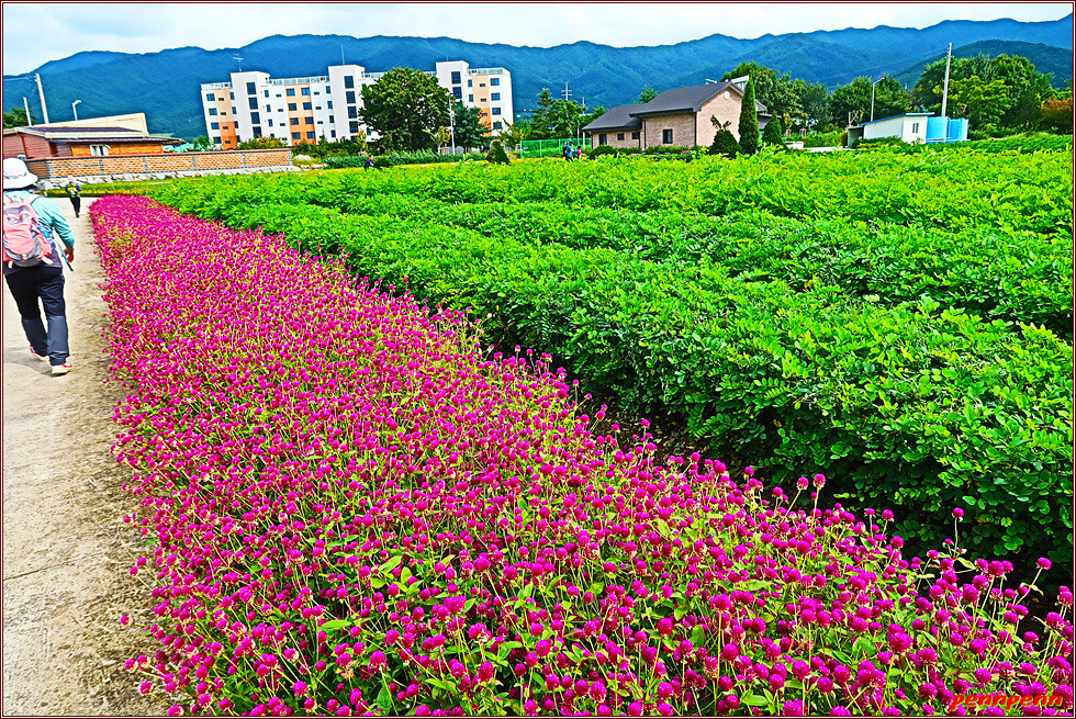 서어나무숲을 나와 람천 둑방길을 계속하다가 임계교 옆을 통과하면 양묘사업장인데요. 이곳에는 낙엽송 등 각종 묘목을 키우는 곳입니다. 그런데 여기서 우측으로 진행하는 도로양쪽에 새빨간 천일홍이 지천으로 피어 있습니다. 지금까지 간간이 천일홍을 만나가는 했지만 이처럼 넓은 밭에 대규모로 피어 있는 천일홍은 처음 봅니다. 운봉 읍내 바로 우측에 있는 산이 전국 제1의 철쭉명산이라는 바래봉(1,165m)이라고 하네요.