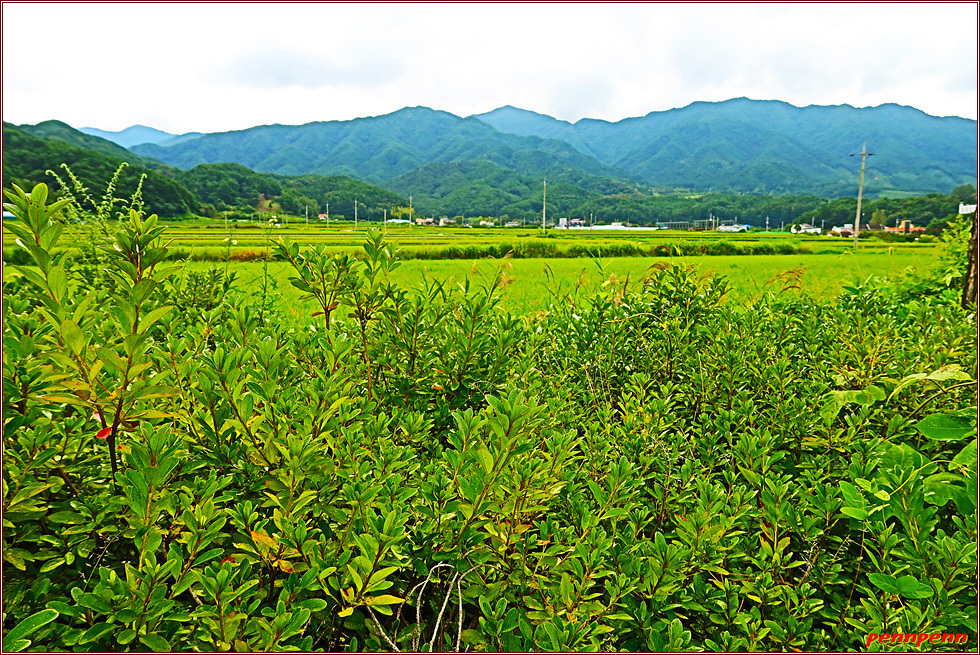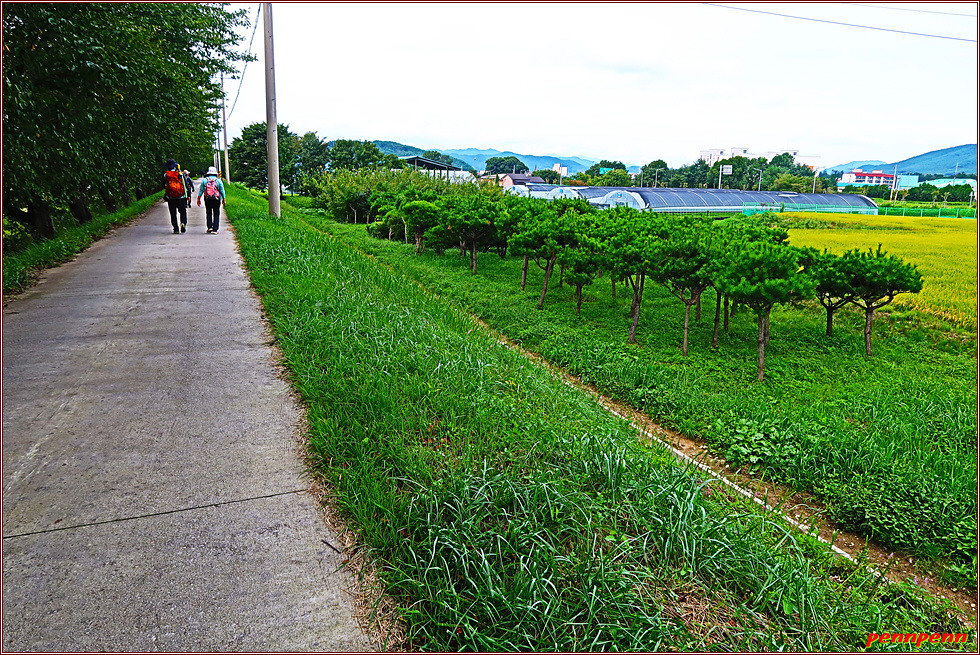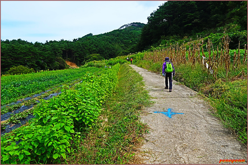 잠시 도로를 따라 가다가 우측으로 진입합니다. 앞으로 2km 구간은 상당한 오르막이라는 안내문을 볼 때만 해도 그리 가파를 줄은 몰랐습니다. 왜냐하면 1구간의 코스안내도 고도표기를 보면 개미정지에서 최고봉인 구룡치까지의 거리는 2km인데 서서히 오르는 모습으로 표기되어 있었기 때문입니다. 논에서는 벌써 벼이삭이 고개를 숙이기 시작했더군요. 조금 더 시일이 지나면 황금들판으로 변할 것 같습니다.