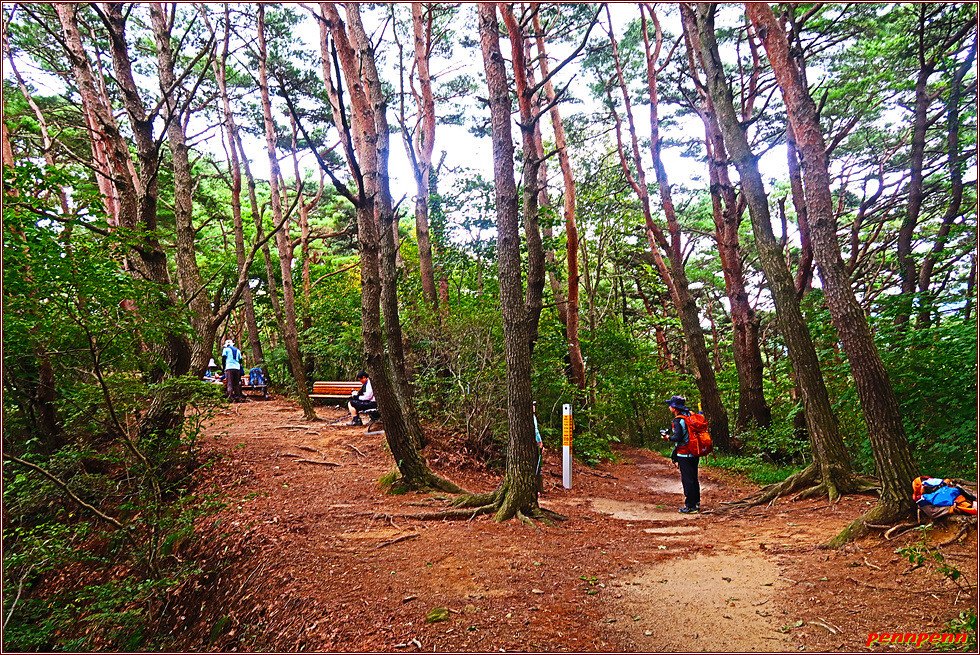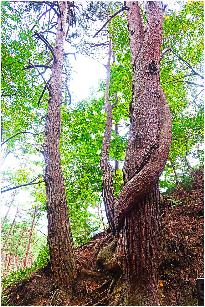 이제부터 산길은 내리막 일변도인데 유달리 소나무군락지가 많더군요. 길목에 두 소나무가 접목된 연리지 나무가 있는데요. 소나무의 모습이 비상하는 용의 모습을 닮았다고해서 용소나무라고 부른답니다. 이 소나무는 사람들에게 행운을 가져다준다는군요.