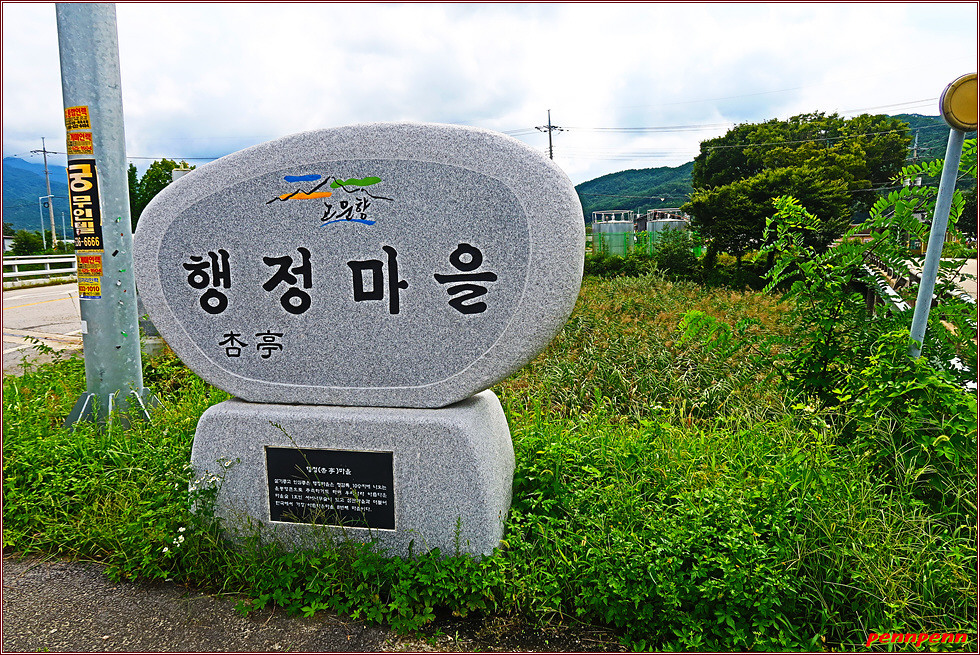 덕산마을 표석이 있는 곳에서 주촌천을 따라 가장마을 방면으로 진입합니다. 주촌천에 걸린 가장교를 건너 다시 둑방길을 갑니다. 벼가 누렇게 익어가는 황금들판을 보며 이곳이 해발 500m의 운봉고원임을 실감합니다. 조금 가다가 우측으로 몸을 돌려세우면 행정마을인데요. 행정(杏亭)마을은 우리나라의 아름다운 마을숲 1호인 서어나무숲으로 유명한 마을입니다.