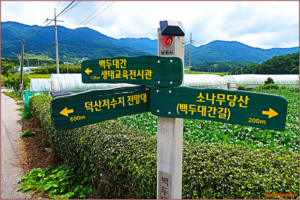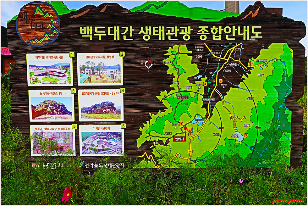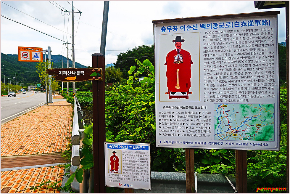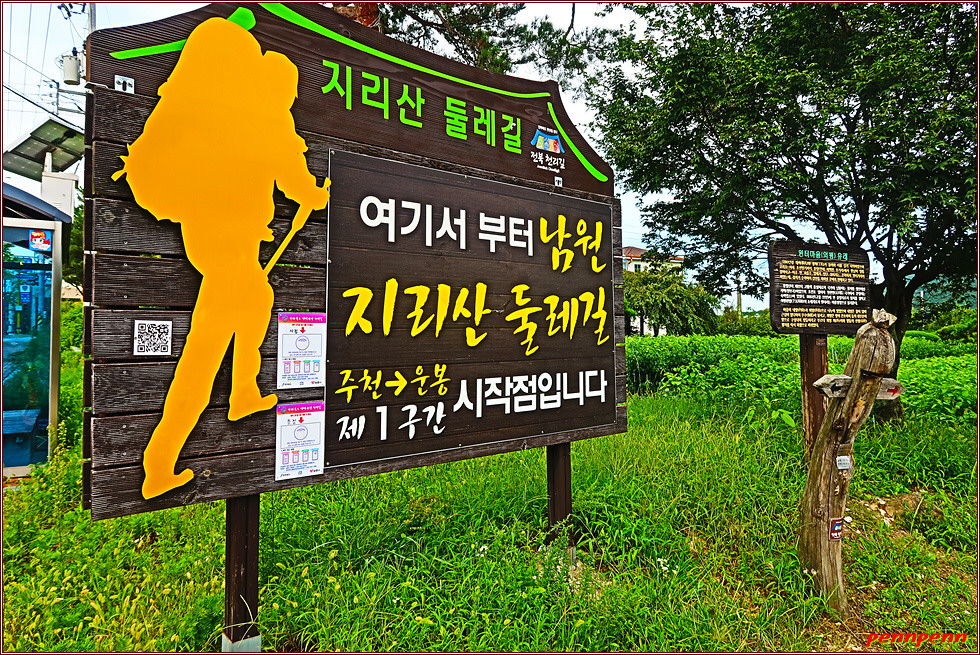 지리산 둘레길의 방향안내문은 장승모습으로 제작한 게 매우 특이합니다. 장승은 기둥 모양의 통나무나 돌 따위에 사람의 얼굴 모양을 새겨 세운 것인데, 붉은 색은 진행방향이며 검정색은 지나온 방향을 나타냅니다. 물론 우리 전통의 장승으로 만들어 친밀감을 주기는 하지만 거리이정표를 지리산 둘레길이라는 세로글씨 밑에 작은 은색으로 붙여 놓아 가독성이 떨어지는 접은 문제입니다. 북한산 둘레길이나 치악산 둘레길처럼 모범적인 이정표가 아니어서 다소 얼떨떨하더군요.