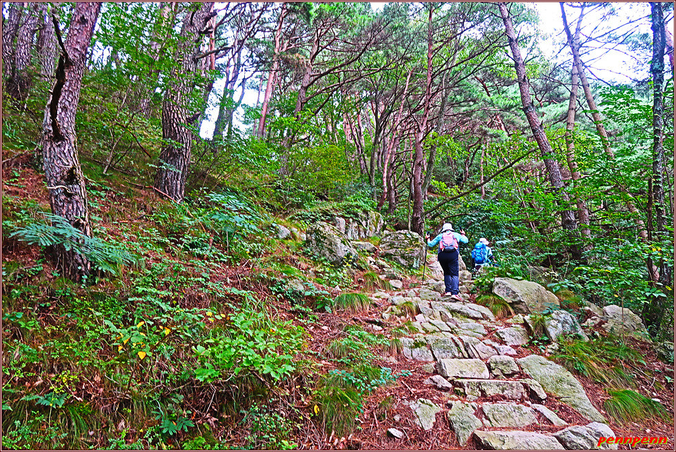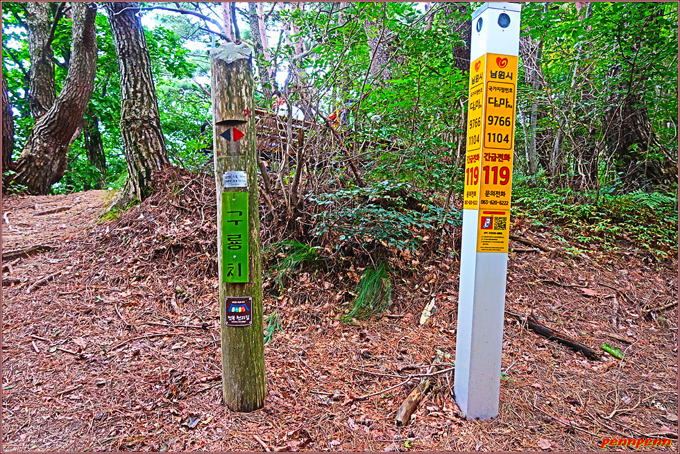 여기서부터 산길은 본격적인 오르막으로 변해 처음 한동안은 완만한 오르막이지만 첫 번 째 고개를 지난 후부터 가팔라지기 시작해 소나무가 많이 보이는 곳(솔정지)은 그야말로 깔딱 오르막입니다. 이곳을 통과하면 드디어 오늘 트레킹의 최고봉인 구룡치(602m)입니다. 아까 출발점의 해발고가가 210m인 것을 감안한다면 약 1시간 10분 만에 고도를 약 400m 높이는 작업이 결코 쉽지 않음을 알 수 있습니다. 우리도 여기서 배낭을 잠시 내려놓고 발길을 멈춥니다.