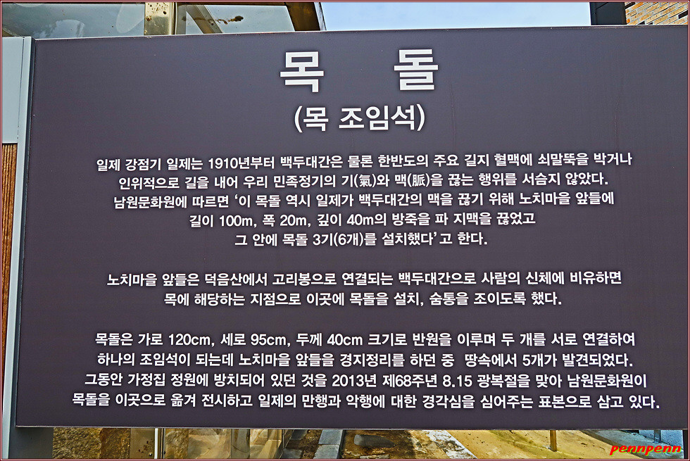 회덕마을 정자나무 쉼터를 지나 좌측의 도로를 따라 들어가면 노치마을인데 백두대간이 관통하는 이곳에는 3점의 볼거리가 있습니다. 갈림길의 좌측 노치마을회관 옆에는 수령 500년이 넘은 보호수 느티나무 한그루(둘레 4.8m, 높이 15m)가 있고, 그 옆에는 일제가 우리 국토의 정기를 빼앗기 위해 백두대간의 맥인 이곳에 목을 조인다는 의미의 목돌(목 조임돌)을 땅속에 묻었고 이를 발굴해 전시해 두고 있습니다. 두 번째는 마을 사람들이 오래전부터 신성시하던 약수터인 노치샘이며, 세 번째는 백두대간길 당산소나무입니다. 보호수로 지정된 4그루의 소나무는 주민들이 마을의 풍요와 안녕을 기원하는 당산제를 지내는 소나무입니다. 이 소나무는 백두대간 생태관광의 주요볼거리에 포함되어 있습니다.