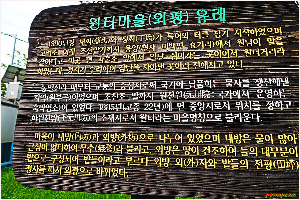 1코스의 들머리는 남원시 주천면 장안리 소재 외평마을의 지리산 둘레길 남원 주천 안내센터입니다. 안내센터 앞에는 지리산 둘레길 코스 안내지도, 충무공 이순신 장군의 백의종군로 안내문, 지리산 둘레길 기종점 안내조형물, 지리산 둘레길 1코스 시작점을 알리는 큼직한 목판, 외평마을의 유래 등 다양한 정보를 알려 주고 있네요.