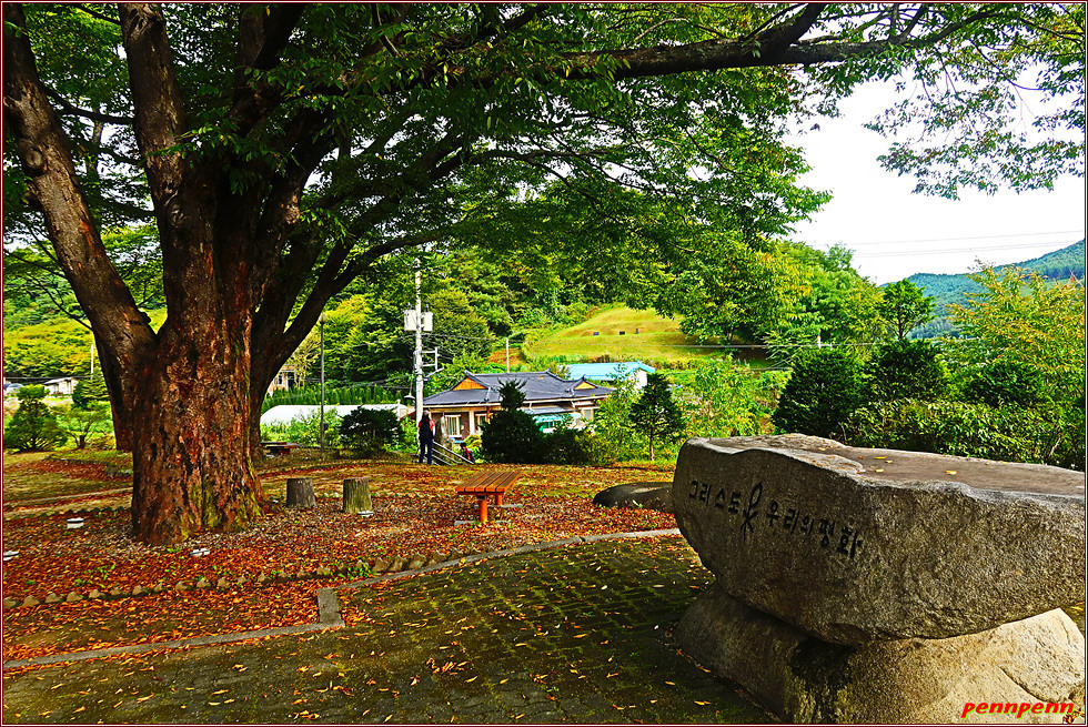 느티나무 아래에는 “그리스도 우리의 평화”를 새긴 글과