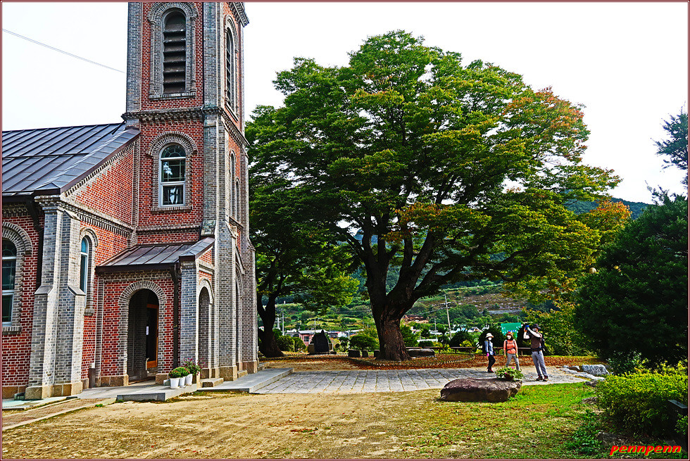 본당 우측에는 아름드리 느티나무가 여러 그루 서있어
