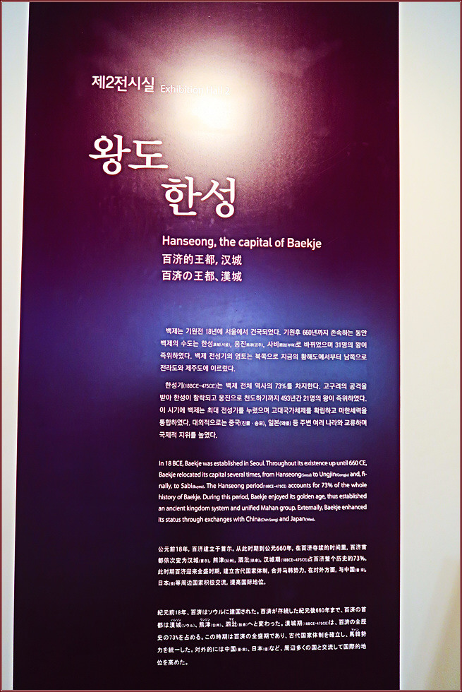 제2전시실의 주제는 “왕도 한성”입니다. 이곳은 백제의 건국과 성장의 시기였던 한성도읍기 493년의 역사를 집약적으로 다루는데요. 백제가 더 큰 나라로 발전하기 위해 위례성에서 한성으로 천도했으며, 풍납토성과 몽촌토성의 모습을 한눈에 볼 수 있습니다. 백제 사람들의 의식주, 놀이와 풍속, 그릇과 기와, 옷차림, 무덤 등 다양한 삶의 모습을 엿보고 주변국과의 교류에 대해서도 설명하고 있습니다.