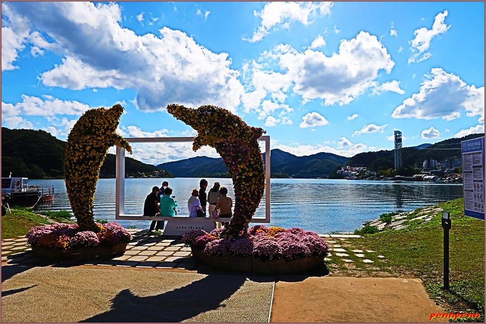 남도로 들어서면 꽃정원의 황상적인 가을꽃들이 방문객을 화사한 미소로 맞아줍니다. 현재 이곳에는 가을꽃인 백일홍, 코스모스, 구절초, 메리골드, 접시꽃, 칸나, 핑크뮬리 등이 북한강 가운데를 양탄자처럼 수놓은 모습입니다. 남도 선착장에서 지명도가 높은 남이섬은 남쪽으로 800m 지점에 위치하고 있습니다.