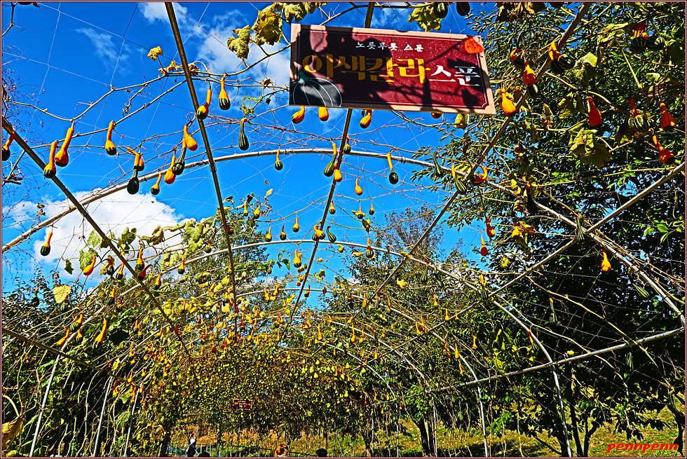자라섬 중도에는 지름 100m가 넘는 거대한 원형 잔디광장을 갖춘 생태문화공원으로 잔디광장 주위는 주차장으로 활용되고 있습니다. 남도의 꽃정원 답사 후 출구 쪽 길목에는 호박터널이 있는데 길이 176m, 폭 3.5m로 조성된 터널에는 애플박, 도깨비방망이박, 베트남박, 수세미, 이색칼러배호박, 여주, 뱀오이 등 13종류의 다양한 박과류를 재배합니다. 호박터널에는 행복의 길이라는 이름이 붙어 있더군요.