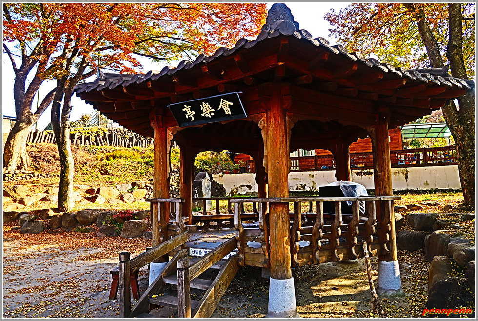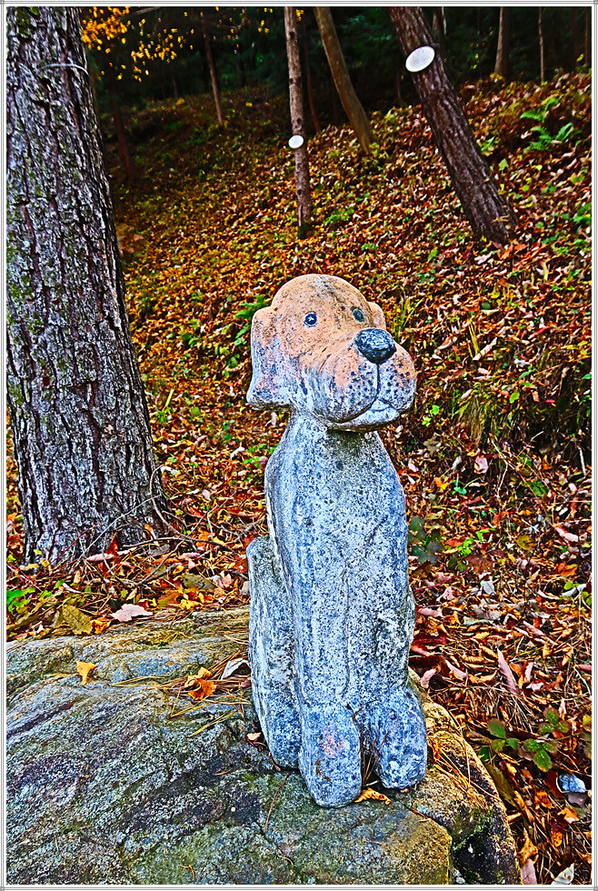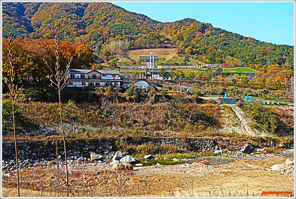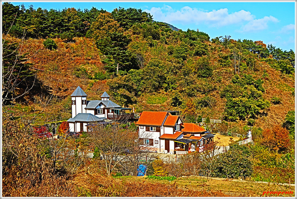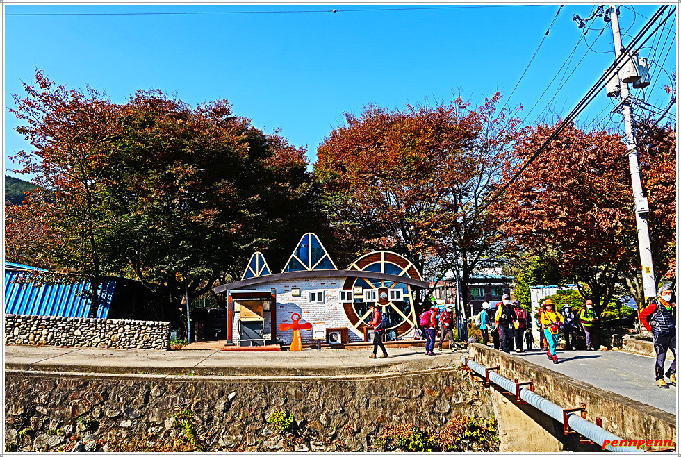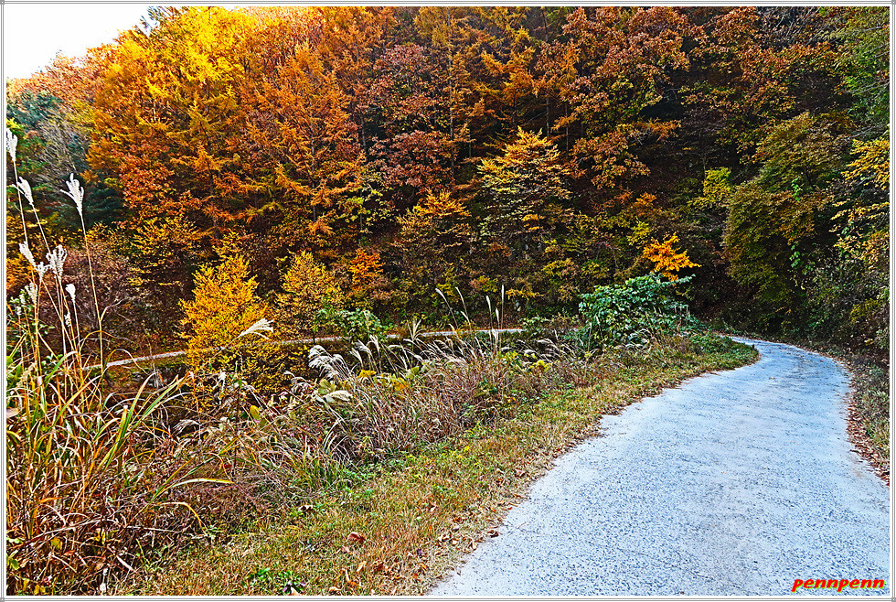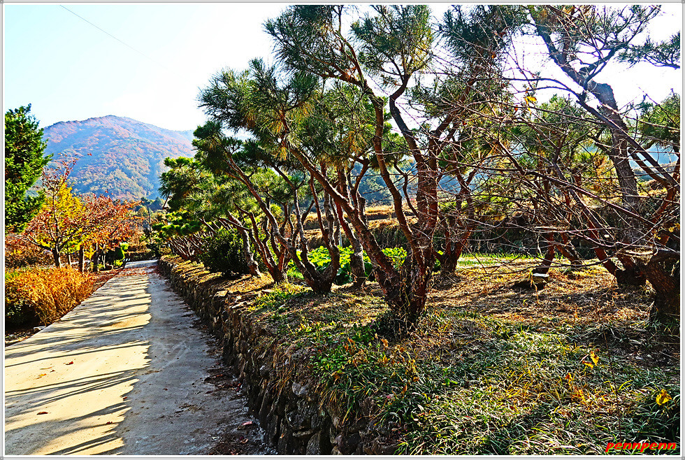 사실 딱딱한 시멘트 도로는 안전하기는 하지만 산길보다도 오히려 걷기가 불편합니다. 주막을 지난 길목에는 강아지 한 마리가 지나가는 행인들을 지켜보고 있군요. 외국어 이름이 붙은 펜션과 농원은 모두 숙박시설입니다. 귀공자 타입의 개 한 마리도 멋진 포즈를 취한 채 짖지도 않고 먼 곳을 바라보는 게 이색적입니다.