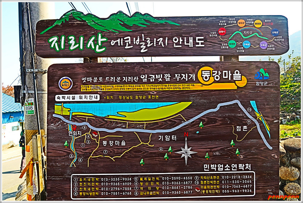 5코스의 들머리는 함양 휴천면 동강리 소재 동강마을입니다. 임천을 가로지르는 엄천교 옆 멋진 화장실이 출발지입니다. 지리산 에코빌리지 동강마을 안내도를 뒤로하고 마을도로를 따라 동쪽으로 갑니다. 동강마을도 산촌의 작은 마을이로군요.