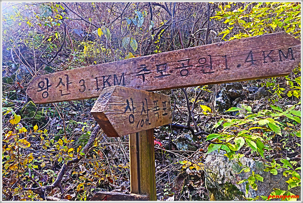 방곡둘레길 체험마을을 지나 오봉천의 방곡1교를 건너 좌측으로 갑니다. 길을 가노라니 맞은편 산기슭에 방금 지나온 추모공원이 보이는군요. 저수지 공사현장을 뒤로하고 우측 상사골로 진입합니다. 돌계단과 나무데크길을 지나면 상사폭포갈림인데요. 상사폭포는 좌측으로 약 100미터 거리에 있는데 지금은 건기여서 물줄기가 약하지만 폭포의 규모가 상당히 크기 때문에 우기에는 매우 웅장할 것 같습니다. 상사폭포는 사랑하는 이에 대한 절절함이 담긴 전설이 깃든 폭포라고 하는군요.