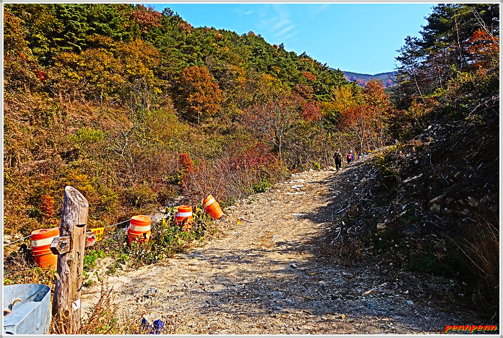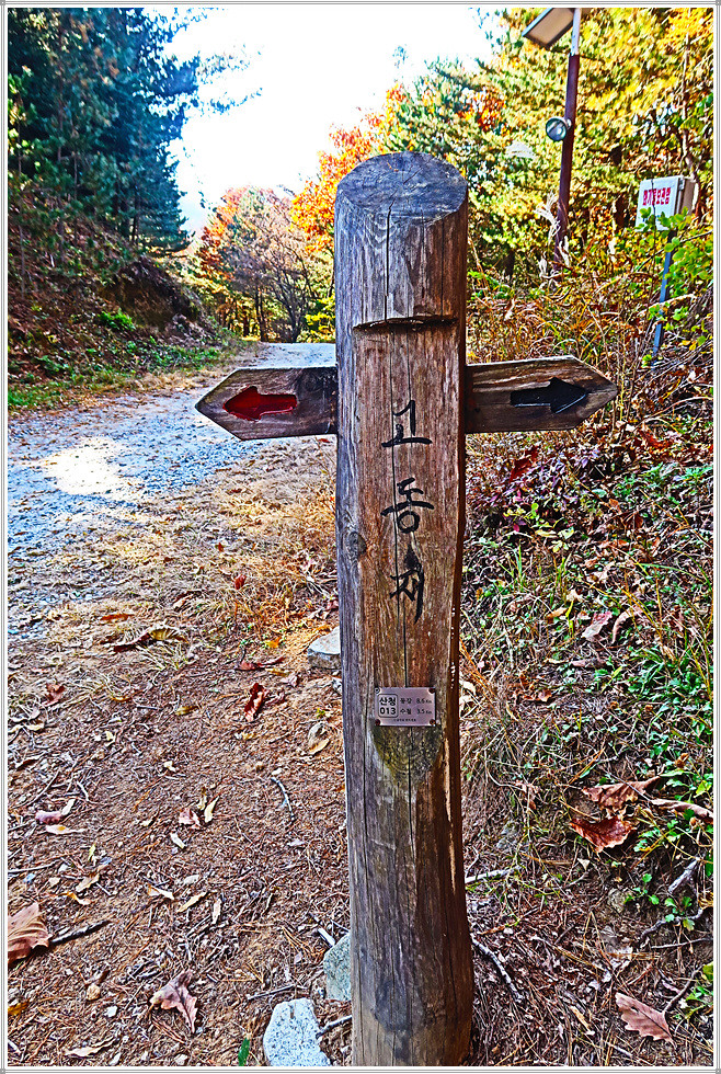 산불감시초소를 내려서 완만한 오르내림을 경험하며 요리조리 돌아가노라면 임도인 고동재입니다. 고동재는 지리산 동부능선과 연결되어 있는 수철동 서북쪽에서 방곡리로 가는 고개로 고동형식으로 생겼다하여 이런 이름이 붙었다고 하는군요. 여기서 목적지인 수철마을까지의 거리는 3.6km입니다.