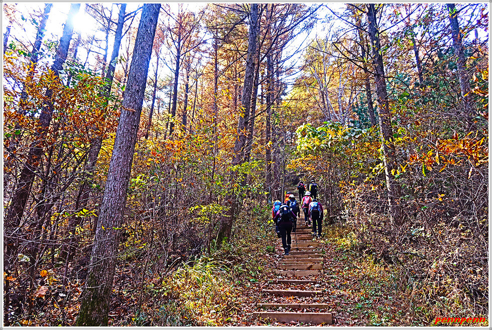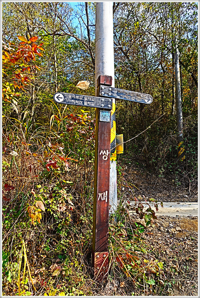삼거리로 되돌아 나와 가파른 계단을 오르면 폭포의 위쪽이지만 조망은 거의 불가능해 그냥 지나칩니다. 이제부터 산길은 매우 부드럽습니다. 소나무 군락지를 지나니 주막(5코스 둘레길 쉼터)이네요. 주막 뒤에서부터는 자동차통행이 가능한 임도인데 좌측 산비탈에는 간벌이 매우 잘 되어 있는 모습입니다. 이어서 도착한 곳은 쌍재입니다. 쌍재는 예전 함양 휴천에서 산청방면으로 오가는 사람들의 왕래가 잦았던 고개마루로 주막과 마을이 있었다고 합니다.