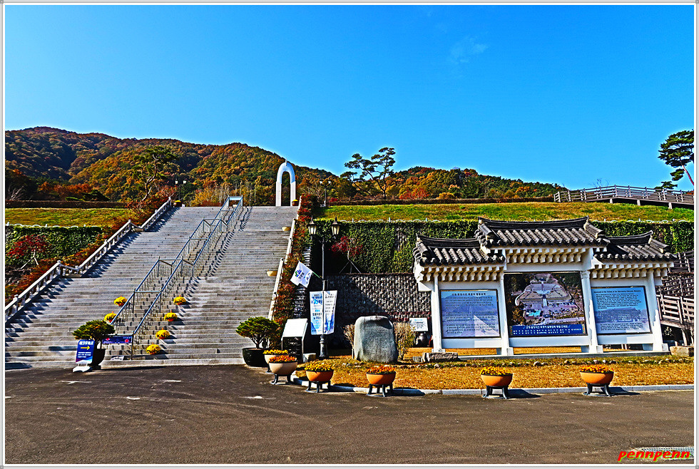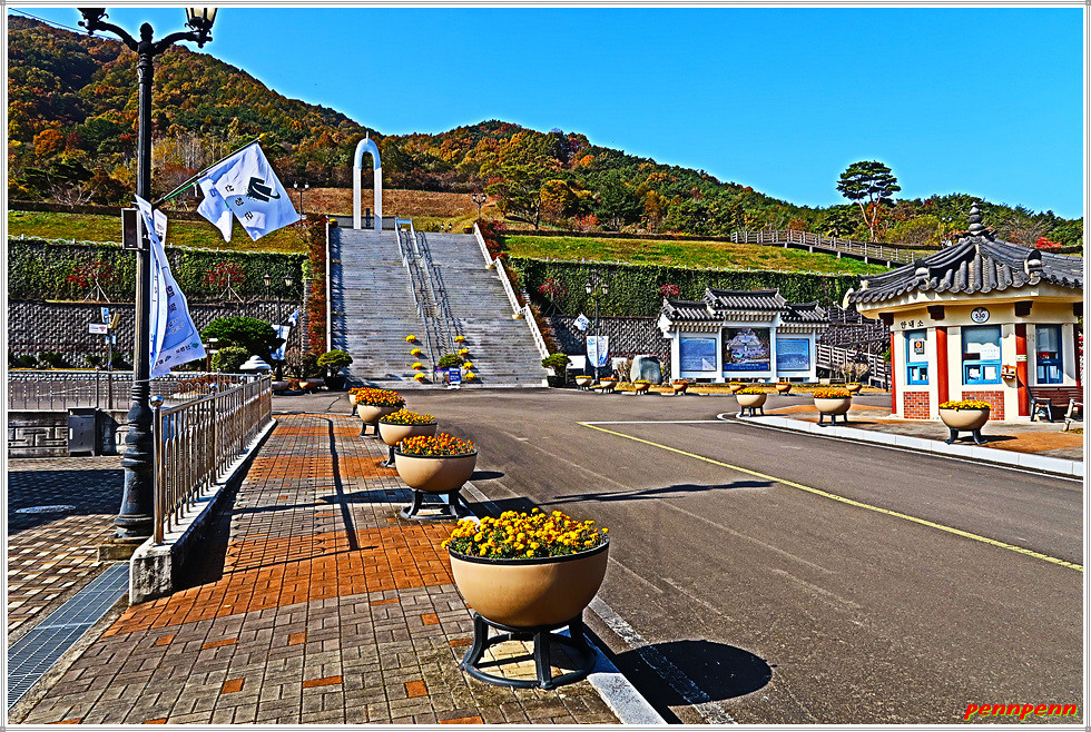 추모공원의 정문인 회양문을 들어섭니다. 안내소 앞에는 지리산 둘레길 5코스 인증 스탬프가 있습니다. 합동묘역 안내도를 보면서 우측 안전계단을 오릅니다. 위쪽에 오르니 넓은 광장에 위령탑이 우뚝하고 위령탑 뒤에는 합동묘역, 그리고 맨 뒤에는 위패봉안각이 있네요. 잠시 발길을 멈추었다가 중앙계단을 이용해 밑으로 내려옵니다.
