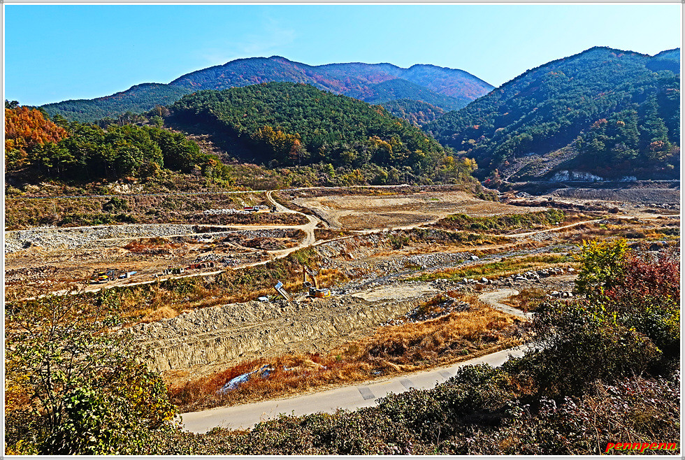방곡마을 이정표가 있는 곳에서 우측으로 몸을 돌려세웁니다. 좌측 오봉천에는 큰 저수지 공사중이로군요. 저수지 둑은 완성되었지만 안쪽의 바닥에는 중장비를 동원한 공사가 한창인데 저수지 이름도 없어 아쉽습니다. 이곳 오봉천은 함양군 휴천면과 산청군 금서면의 경계입니다.