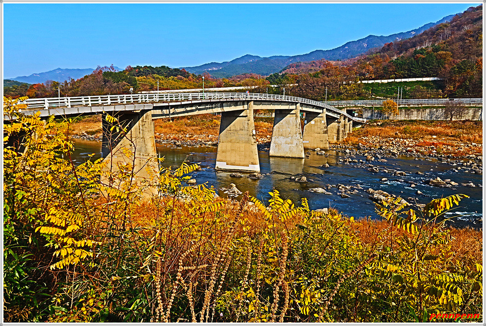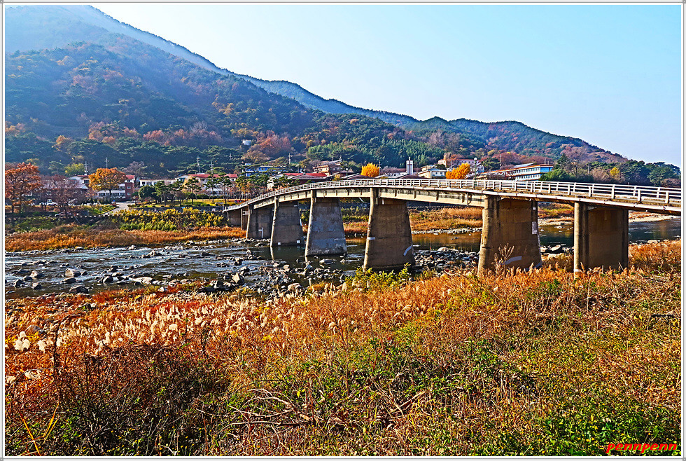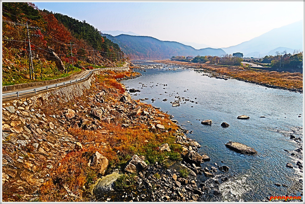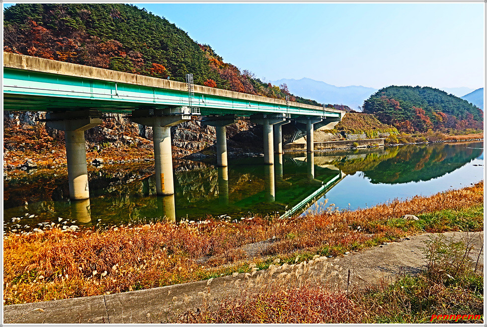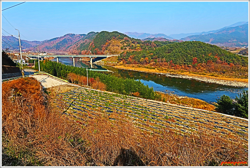 대장마을을 지나갑니다. 요즘 정치권 뉴스의 초점이 되고 있는 경기도 성남의 아파트단지도 대장동이고, 3기 신도시인 부천시 지역도 대장지구 공공주택단지인데 이곳 산청에도 대장마을이 있군요. 건설중인 대장교를 건너 우측으로 갑니다. 통영대전간 고속도로의 경호강 2교의 교각 밑을 지나가면서 바라본 강은 바로 금서천이 합류하는 남강이지요. 남강변의 가로수인 메타세콰이어는 단풍이 곱게 물들어 있습니다.