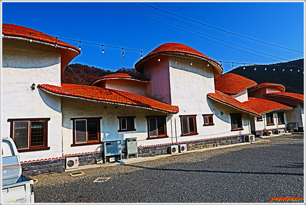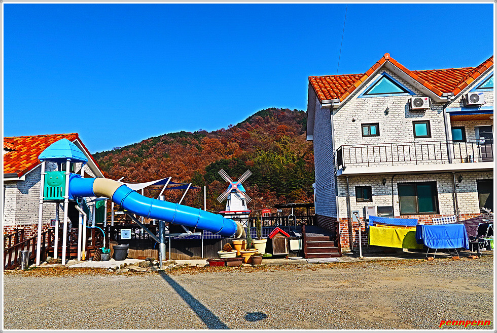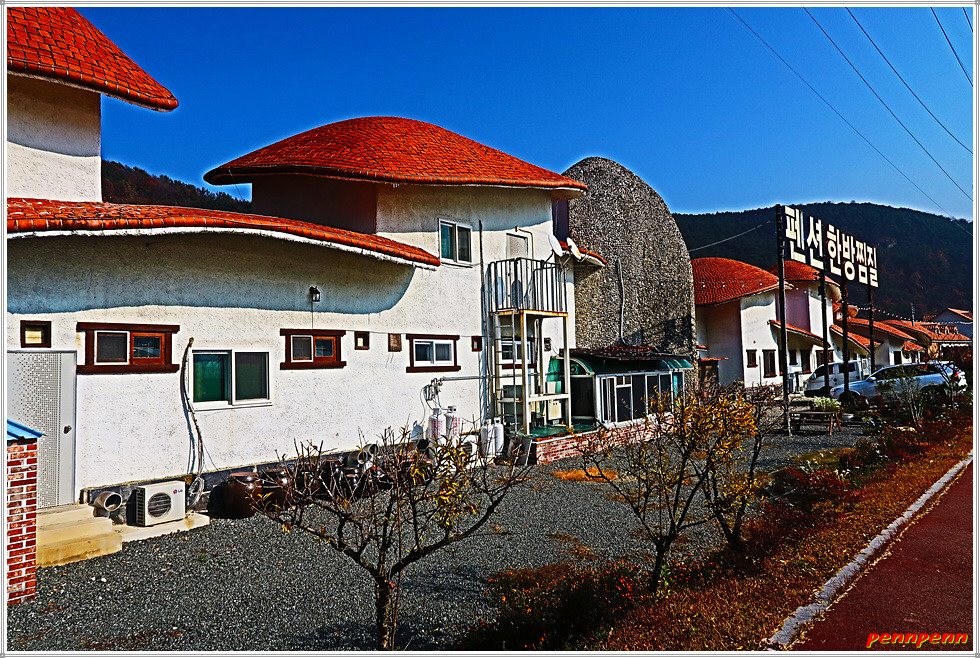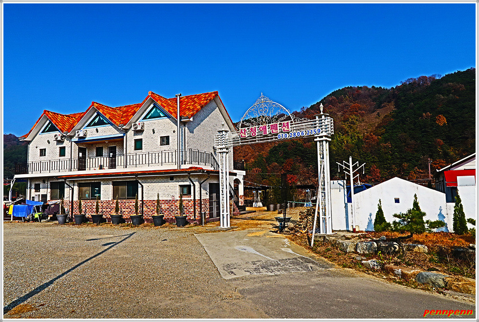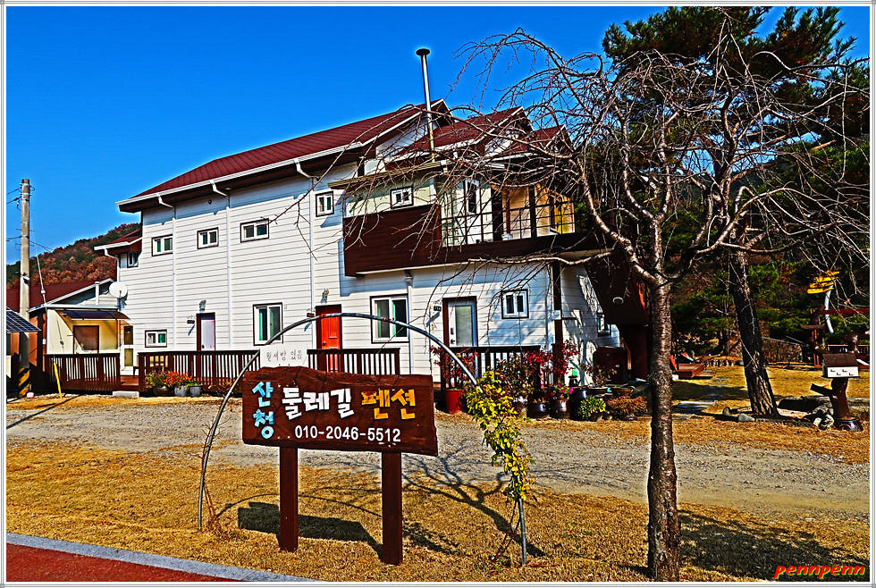 남강을 가로지르는 내리교를 건너가면 지리산 둘레길 6코스 갈림길인데요. 직진하면 웅석계곡을 따라 선녀탕을 경유하는 길이지만 필자는 좌측으로 남강변을 따라 갑니다. 여기서는 아래쪽 강변길을 걸어도 되지만 위쪽 도로를 걷는 것도 좋습니다. 왜냐하면 도로변에는 펜션한방찜질, 산청애펜션, 강여울 펜션, 산청둘레길펜션 등 아름다운 외관의 여러 펜션을 볼 수 있기 때문입니다. 오늘 6코스에서 아까 만났던 해동선원에 이어 두 번째의 볼거리로 손색이 없습니다.