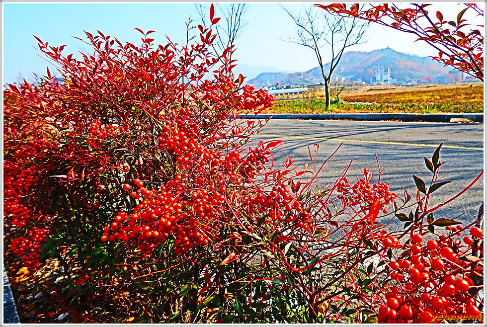 도로변의 산청고등학교는 그 규모가 매우 크게 보입니다. 면학정(勉學亭)을 지나면 꽃봉산(238m)의 전망대가 올려다 보이는데 이곳에 오르면 사방팔방으로 일망무제의 조망이 펼쳐진다고 합니다. 도로변에는 관상수로 많이 재배하는 남천의 붉은 열매가 알알이 영글고 있는데요. 이의 모습은 마치 약재로 쓰이는 마가목의 열매와 유사합니다.