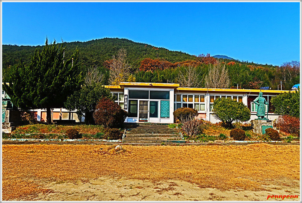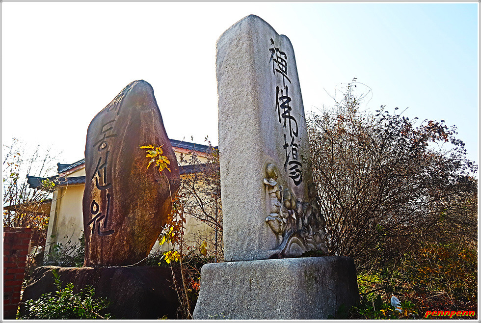 평촌마을 버스정류소가 있는 곳에서 우측으로 방향을 돌리면 이번 코스의 가장 주요한 볼거리인 원각사 해동선원입니다. 오래된 폐교를 사찰로 활용하고 있는 이곳에는 야외에 불교관련 각종 석각(석조조형물)이 전시되어 있어 길손의 발길을 멈추게 하는 곳입니다.