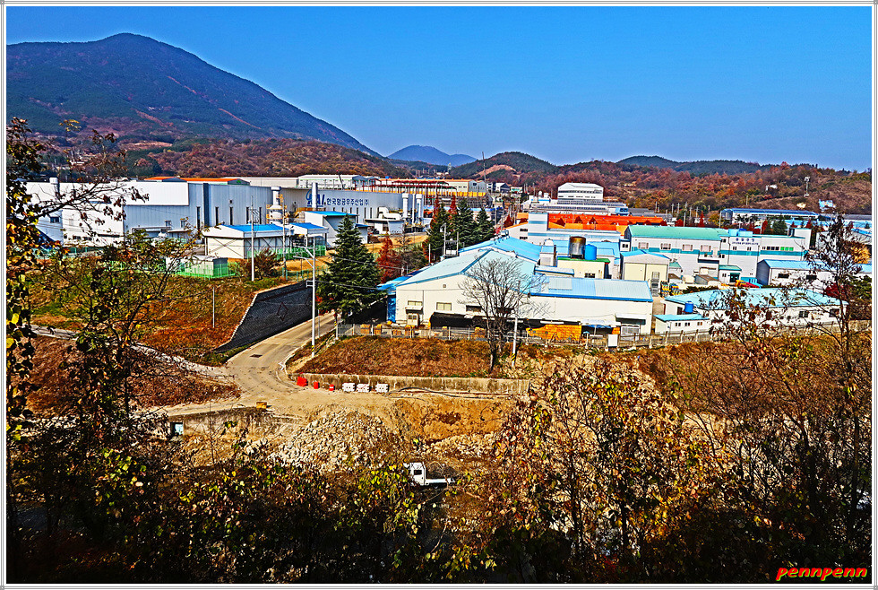 평촌마을 경노당을 지나 평촌2교를 건넌 후 굴다리를 통과하면 좌측에 공단이 보이는데요. 금서천변의 대형 공장 같은 건물에는 한국항공우주산업(KAI)이라는 글씨가 보이고 그 옆 단지에는 식품업체인 오뚜기의 광고가 있습니다. KAI본사는 경남 사천시에 있는데 이곳 산청에도 분점(또는 연구소)이 있는 것 같습니다.