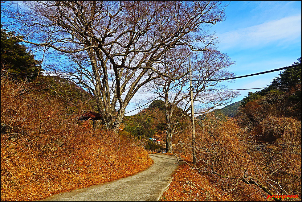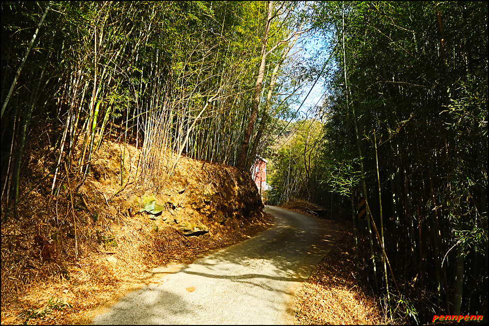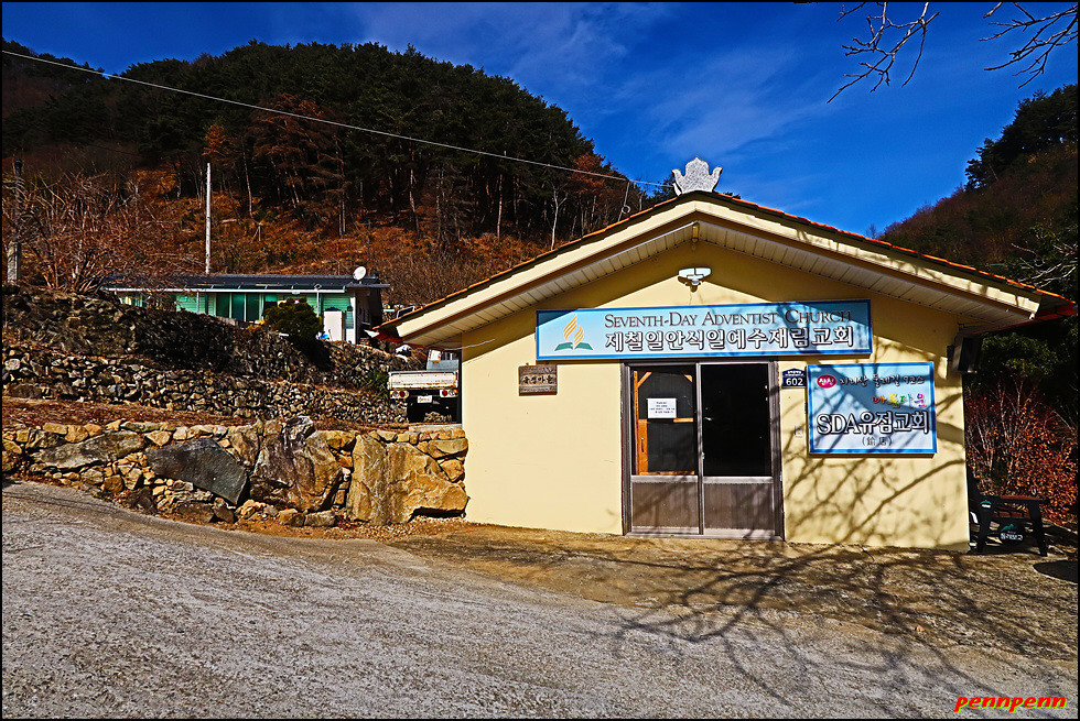 계곡 안쪽까지 도로가 개설되어 있어 현지 주민들은 편리하겠군요. 놋점골 쉼터를 지나면 유점마을인데, 유점마을을 놋점이라 부른 것은 예전에 유기그릇(놋그릇)을 만들었기 때문입니다. 상당히 가파른 도로를 오르면서 길목에 유점교회(제칠일안식일예수재림교회)를 지나 좌측으로 돌아가면서 대나무 군락지를 통과합니다.