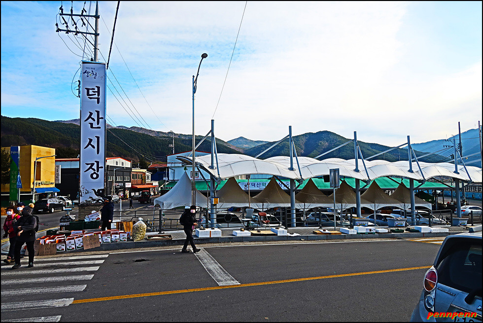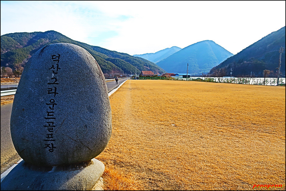 천평교를 건너면 덕산체육공원 앞 산청곶감유통센터인데요. 여기서 둘레길은 덕천강을 따라 둑방길 도로로 이어집니다. 지리산 천왕봉 계곡의 물길이 만든 덕천강은 하동군 옥종면에서 남강으로 흘러든 뒤 나중에 낙동강으로 합류하는 강입니다. 도로를 걸으며 뒤돌아보면 덕천강 뒤로 지리산 천왕봉 능선이 선명합니다. 오늘 전국적으로 미세먼지농도가 매우 나쁨 수준이어서 걱정했지만 산청땅으로 접어들자 하늘이 맑아져 이처럼 멋진 풍경을 볼 수 있음은 정말 다행입니다. 송하마을 이정표를 지나면 덕산그라운드 골프장이 있는데 이런 산촌마을에도 골프장(비록 소규모이기는 하지만)이 있는 것을 보면 한때는 귀족스포츠의 대명사처럼 여겼던 골프가 이제는 대중화 된 느낌입니다.