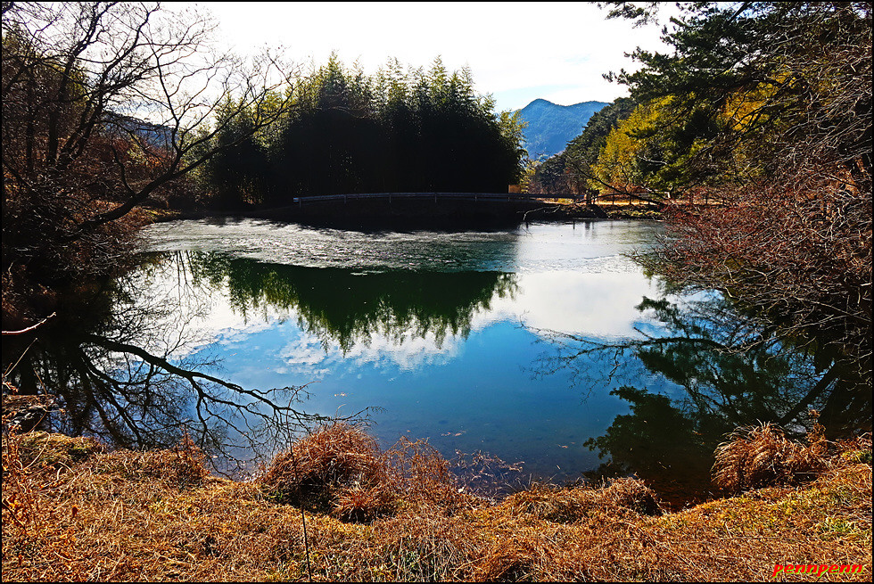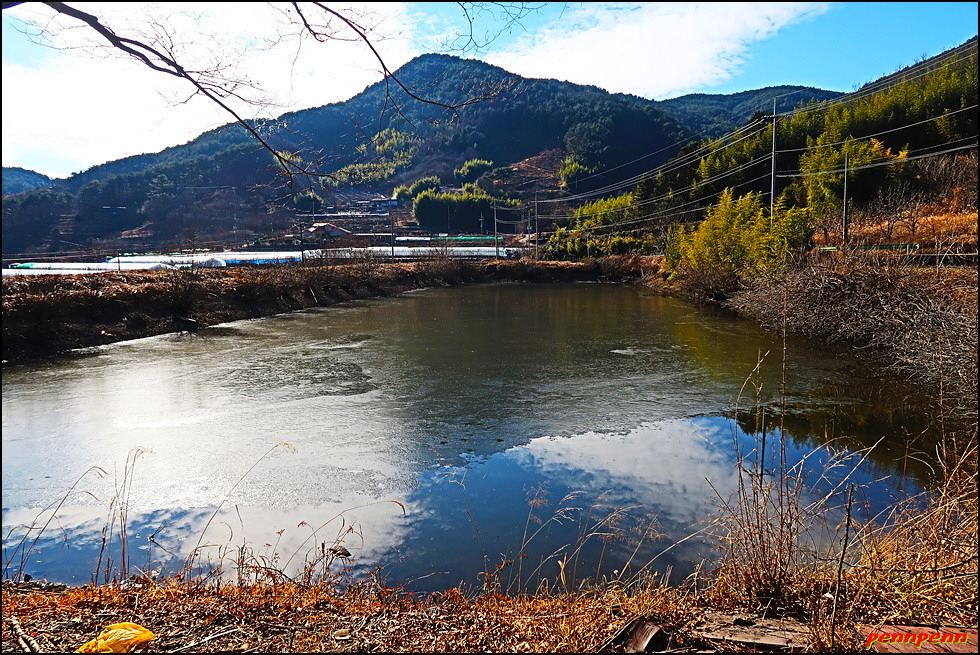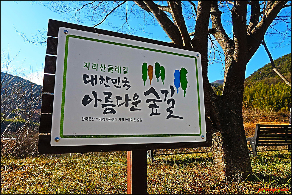 대숲을 빠져나와 이름이 없는 연못을 지나갑니다. 진행방향으로 멀리 이름 모를 산의 능선이 잘 조망됩니다. 길을 가면서 주위를 살펴보면 군데군데 대숲의 모습이 보이네요. 잠시 후 위태마을에 도착해 9코스 트레킹을 마무리합니다. 상촌저수지 옆에 위태마을회관이 있네요. 지리산 둘레길이 한국등산 트레킹 지원센터가 지정한 아름다운 숲길이라는 안내문이 눈길을 끕니다. 이런 숲을 보려면 녹음이 우거지거나 단풍이 든 계절에 찾아야하는데 1월의 둘레길은 매우 썰렁하네요.