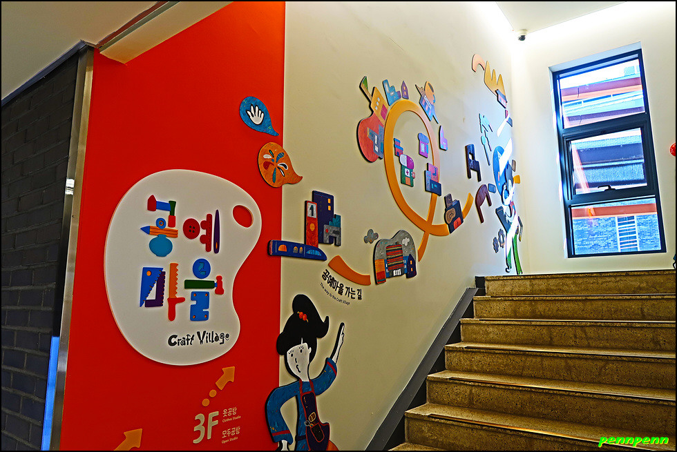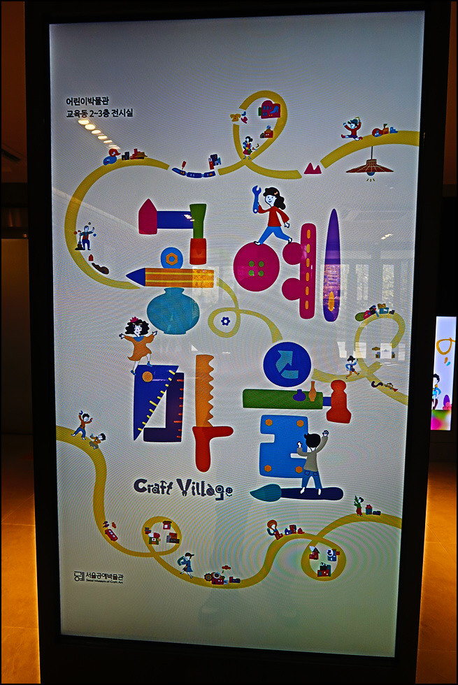교육동 2-3층은 어린이박물관인데 일명공예마을이라고 합니다. 공예마을은 모두 5개의 공방으로 구성되어 있는데 2층에는 그릇공방, 가구공방, 철물공방이 있고, 3층에는 옷공방과 모두공방이 있습니다. 이들 공방은 어린이들이 실제로 공예활동과 관련된 체험을 할 수 있는 곳으로 어린이박물관이라기 보다는 어린이공예체험마을이라고 부르는 게 더 적합할 것입니다. 공예마을로 가는 계단에는 재미있는 입체벽화가 붙어 있어 어린이들의 동심을 자극합니다.