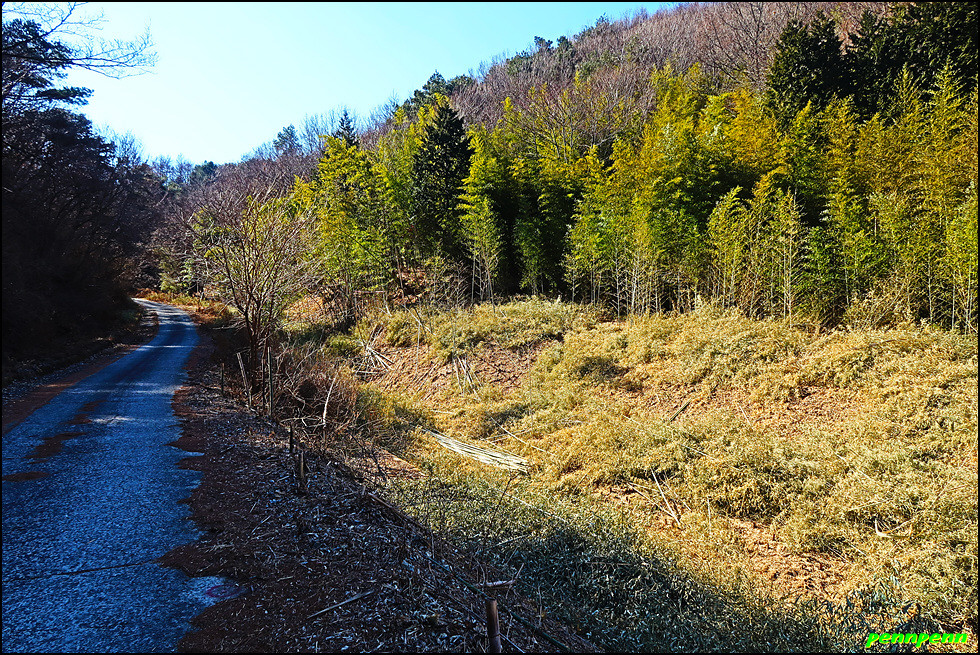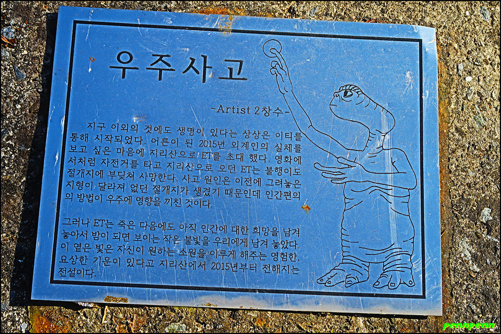 궁항마을회관 앞 맞은편으로 이어진 마을 도로를 따라 양이터재로 갑니다. 길을 가면서 뒤돌아보니 궁항마을회관이 벌써 저만치 멀어져 있습니다. 대나무숲을 지나 듬성듬성 보이는 양이터마을의 가옥을 보면서 점진적으로 고도를 높입니다. 도로 아래쪽에 간혹 보이는 민가에서 연기가 피어오르고 산골의 작은 개는 지나는 길손을 오랜만에 본 듯 목이 터져라 짖어댑니다. 가는 길목의 길바닥에 “우주사고”라는 안내문이 있는데요. ET가 자전거를 타고가다 길을 잃고 추락한 우주사고 현장으로, ET 그림과 함께 부서진 자전거 하나가 콘크리트 바닥에 놓여 있는 어느 예술가의 작품이었지만 지금은 자전거는 없어지고 안내문만 길바닥에 놓여 있습니다.