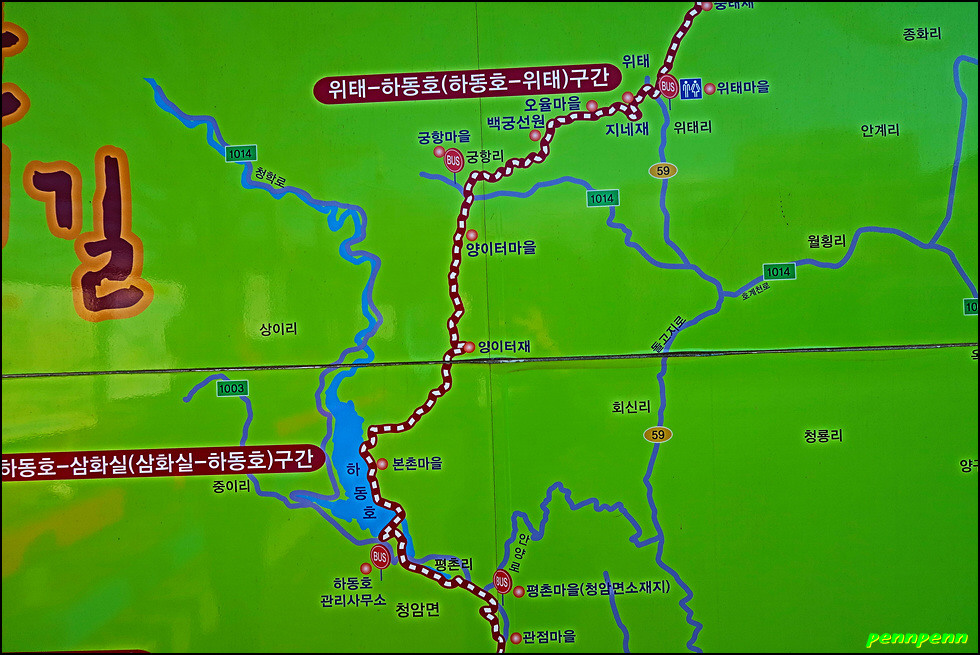 ▲ 코스 : 위태마을회관(상촌제)-지네재-오율마을-고개-궁항마을-양이터마을-양이터재-나본마을-하동호-하동호사무소