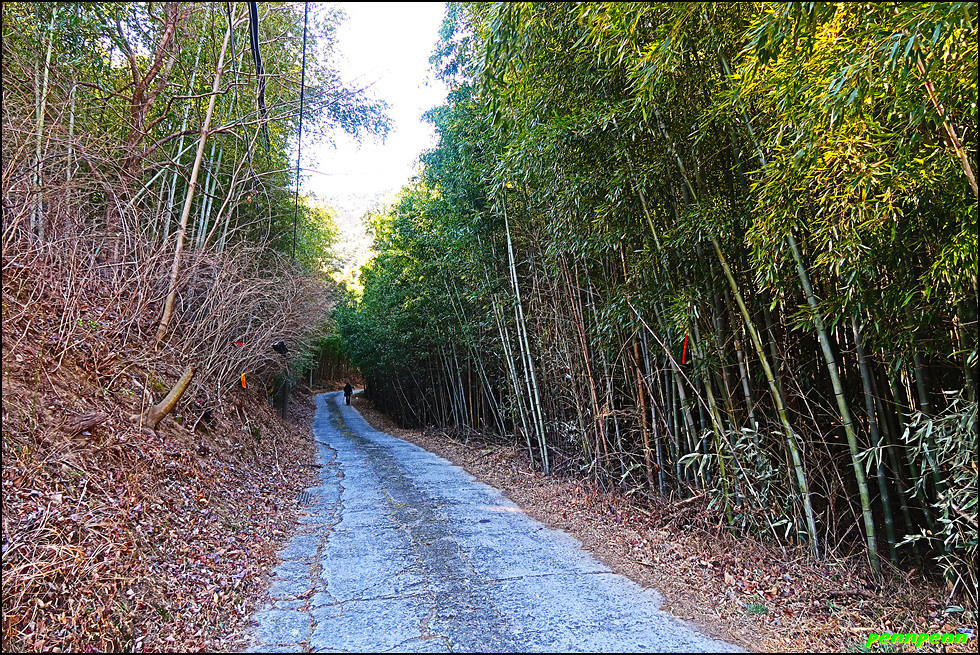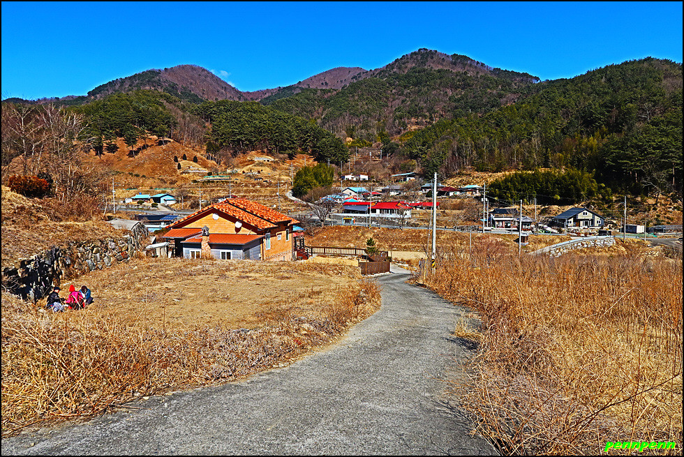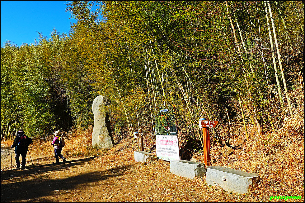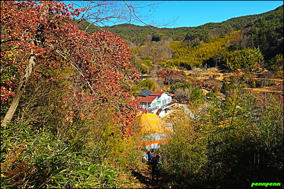 지네재를 내려서는 길목에도 대나무숲이 있네요. 주산(831m) 등산 안내도가 있는 곳을 뒤로하면 민가가 몇 가구 보이는데 바로 오율마을입니다. 지나가는 길목 어디에도 오율마을을 알리는 문구를 발견할 수 없었습니다. 오율마을은 몇 개의 작은 마을이 모여 하나의 행정마을을 이루고 있는 촌명으로 주위에 닥나무가 많아서 일부마을에서 한지가 생산 되었다고 합니다. 주민들은 지네재 아래까지 올라가 농사를 지어야 했던 산골마을의 고단한 일상을 견디어 왔다는군요.