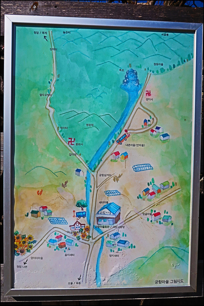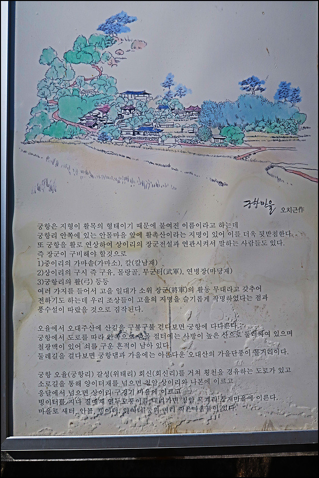 궁항마을회관 앞에는 지리산 둘레길과 마을을 알리는 홍보물을 화보처럼 제작해 세워두고 있어 여행자 입장에서는 마을을 소개하기도 참 좋습니다. 궁항은 지형이 활의 목 형태라서 붙여진 이름으로 사방이 높은 산으로 둘러싸인 산골로서 철광맥이 있어 쇠를 구운 흔적도 남아 있다고 합니다.