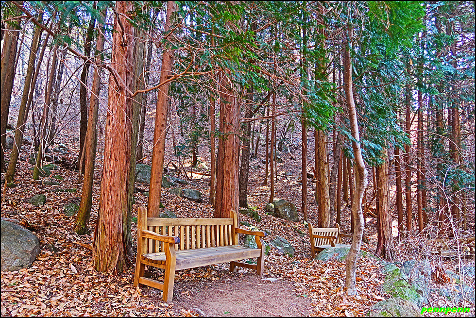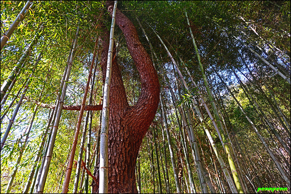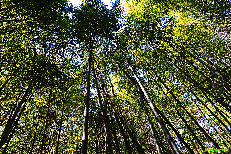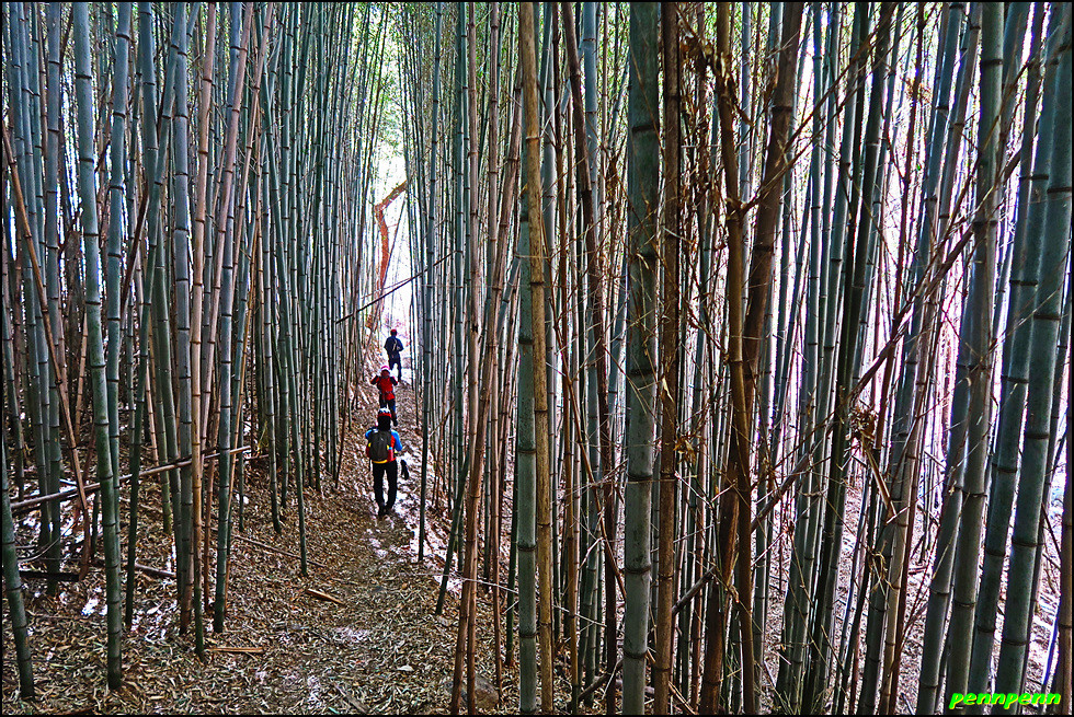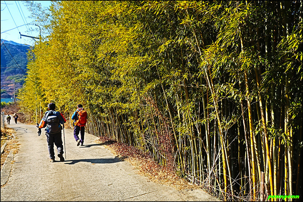 임도에서 우측의 숲으로 내려서는 길목에는 우천 시 우회하라는 안내문이 있는데 실제로 걸어보니 두 세 차례 작은 계곡을 건너야하는 지점에서는 비가 내리면 계곡이 범람해 건너지 못할 지경이니 꼭 이를 준수해야할 것입니다. 이제부터는 본격적으로 대숲이 많은 구간을 지나갑니다. 전남 담양의 경우 죽세공이 유명한 데 이곳 하동은 대나무로 무얼 하는지 잘 모르겠군요. 양쪽으로 빽빽한 대숲을 통과하니 드디어 하동호가 보이기 시작합니다.