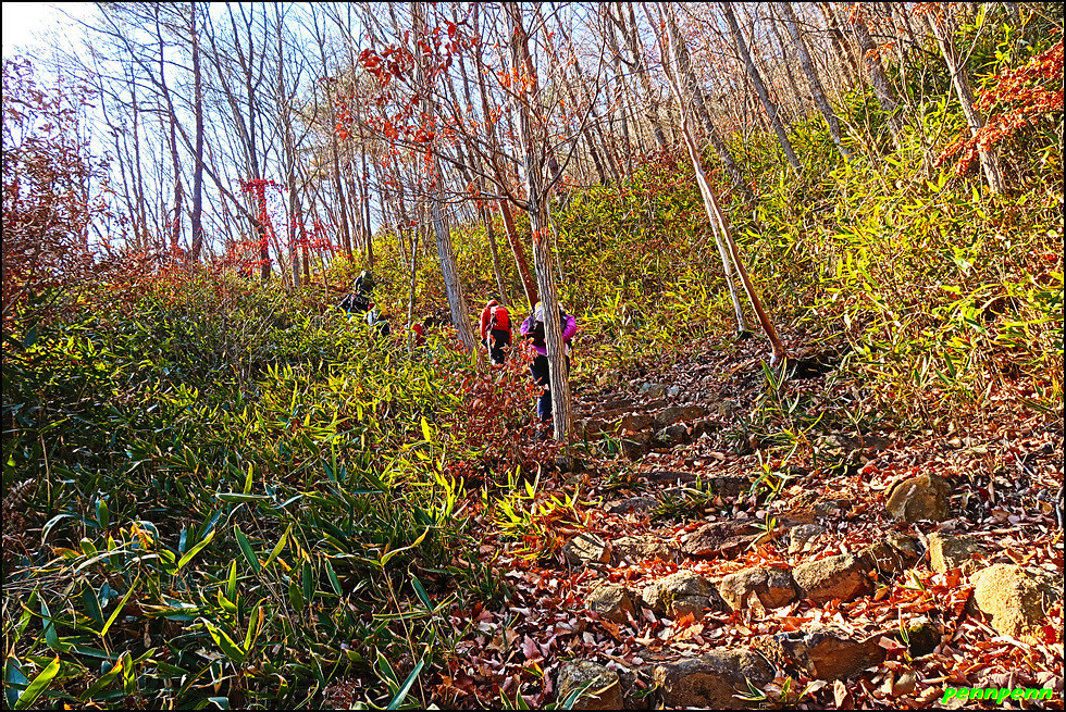 잠시 후 가파른 산길로 접어듭니다. 오르면서 뒤돌아봐도 민가를 거의 찾을 수 없을 지경입니다. 경사가 점점 더 가팔라질 즈음 고갯마루 이정표를 보니 출발지인 위태마을에서 3.1km를 왔으며 목적지인 하동호까지는 8.4km를 더 가야 합니다. 고도가 거의 비슷한 길을 한참 동안 걷노라니 임도를 만나게 되고 좌측으로 내려서니 1014번 지방도로가 지나가는 궁항마을입니다. 이는 지나온 두 번째 고개로 원래 이름이 없는 것인지 잘 모르겠네요.