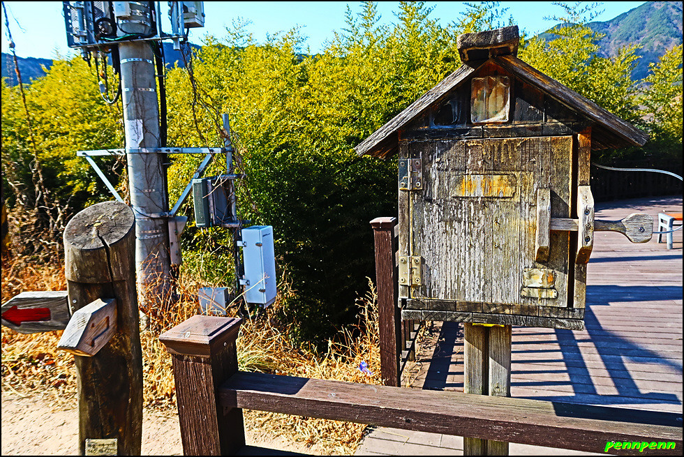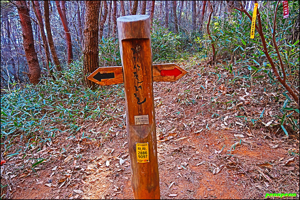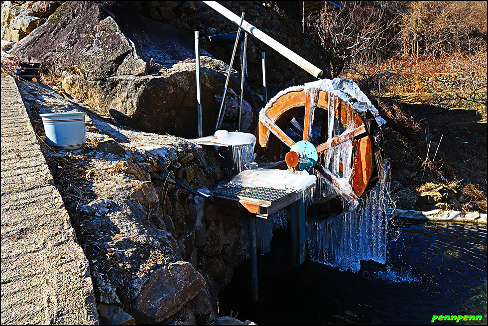 우측으로 방향을 틀어 완만한 경사의 길을 걷습니다. 대나무숲을 지나면 경사가 다소 가팔라지는데 얼음으로 범벅이 된 물레방아가 산촌마을의 추위를 말해주는 듯 합니다. 길이 점점 좁아지더니 드디어 산길로 변하네요. 뒤돌아보니 고도가 제법 높아진 모습입니다. 매우 가파른 돌계단 길을 오르니 첫 번째 고갯마루인데 지리산 둘레길을 알리는 방향표시 이정목만 있을 뿐 고개이름을 알 수 없습니다. 나중에 목적지인 하동호(관리사무소)에 도착해 현지 지도를 보니 이곳은 고개의 지형이 지네처럼 보인다는 지네재이더군요. 이정목에 고개이름을 적어놓았더라면 참 좋았을 텐데 무척 아쉽습니다.