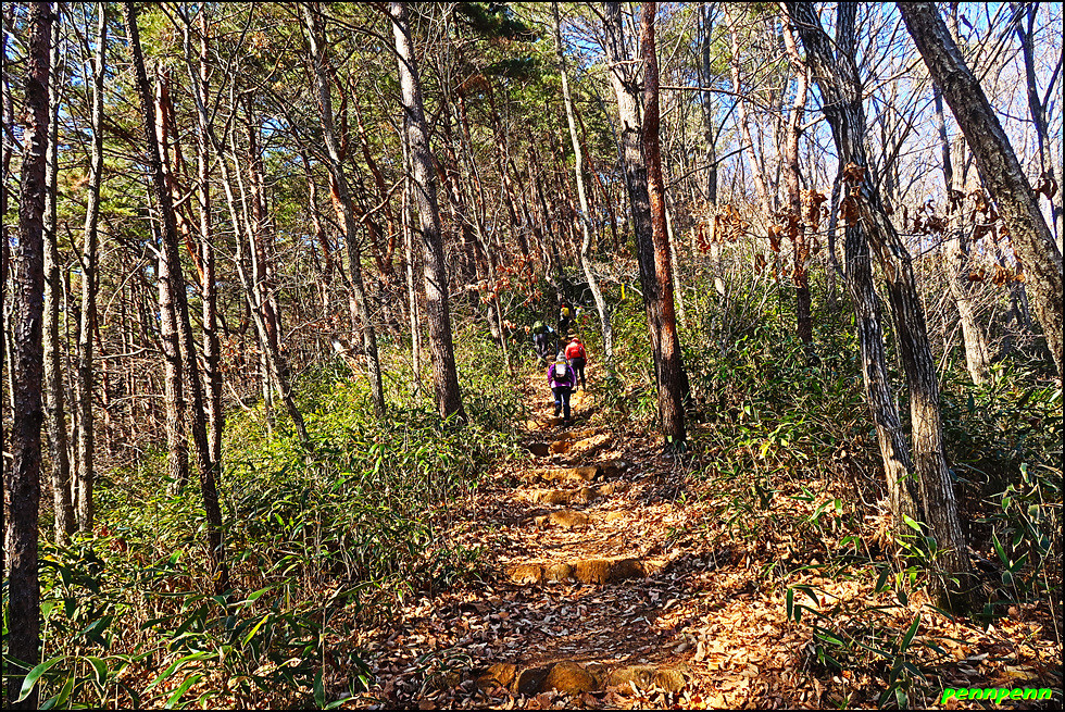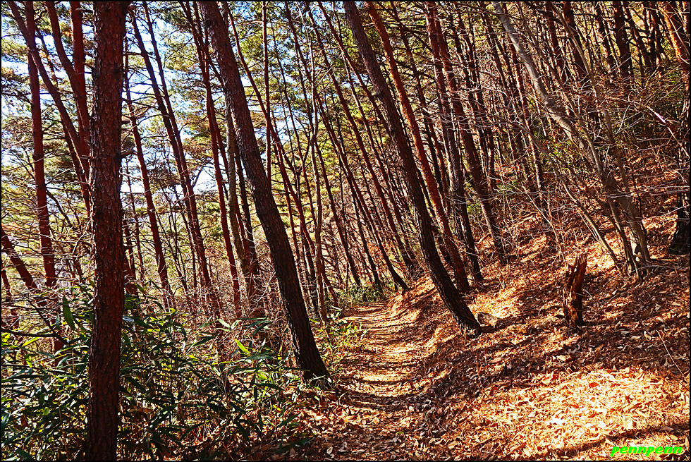 대숲 군락지를 지나 고갯마루로 올라서면 드디어 오늘 코스 중 가장 높은 양이터재(513m)인데요. 이곳은 하동군 옥종면과 청암면을 잇는 경계로 낙남정맥이 통과하는 곳이기도 합니다. 이제부터는 내리막 일색이어서 힘든 구간은 없습니다. 비포장 임도를 따라 가면서 바라본 하동호로 이어지는 계곡이 상당히 깊습니다.