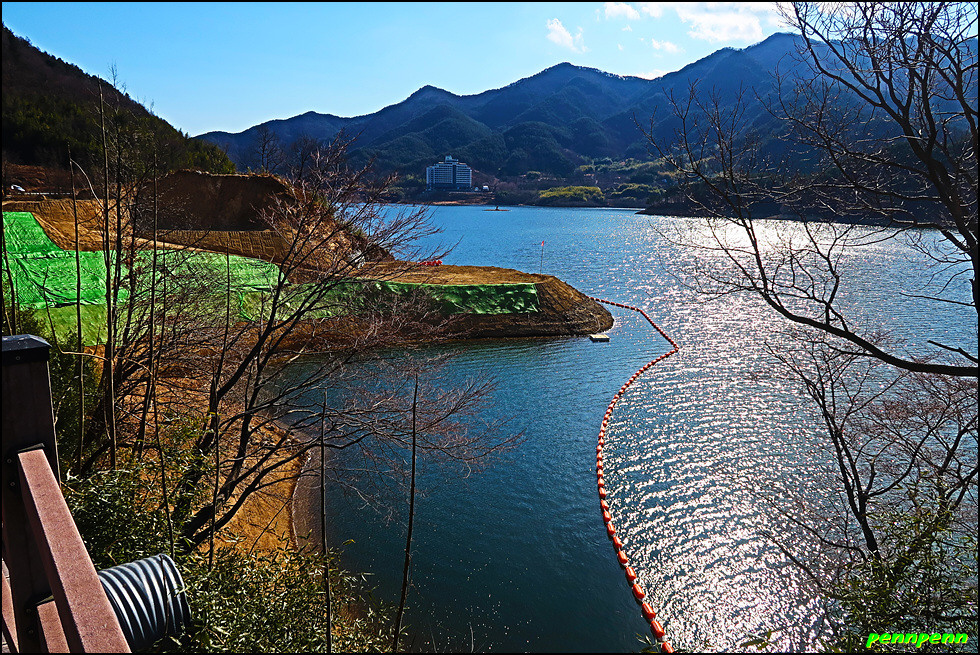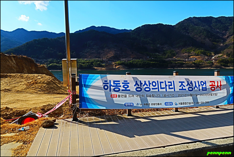 북쪽으로 갈수록 호수의 모습은 더욱 아름답게 보이는데 가을 단풍계절에 걸으면 정말 멋질 것 같습니다. 쉼터를 지나자 공사구간이 나타나는데요. 현지의 현수막을 보니 “하동호 상상의 다리 조성사업 공사”(2021. 10-2023. 9)라고 하는군요. 그러고 보니 호수 맞은편에도 공사 중인데 아마도 상상의 다리 교각설치를 위한 부지정리중인 모습입니다.