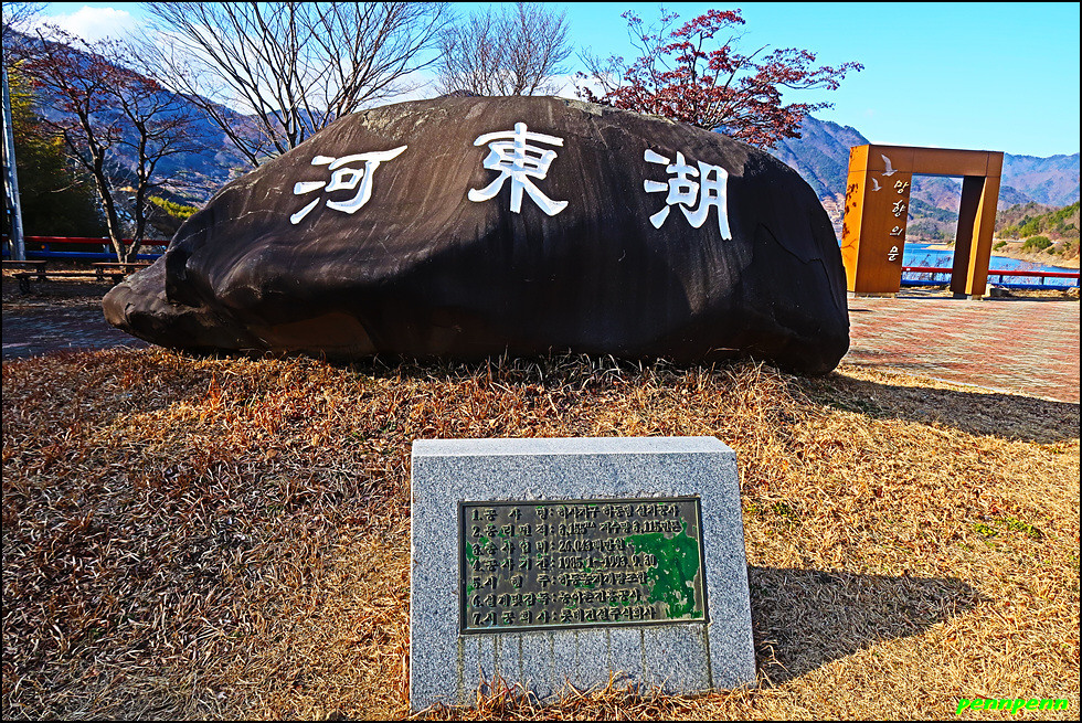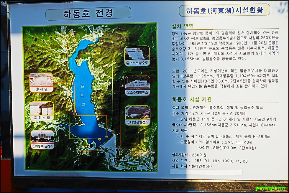 청암면 평촌리 하동호관리사무소에는 대형표석과 하동댐 건설로 수몰된 이주민을 위한 망향의 문, 그리고 지리산 둘레길 10코스와 11코스를 알리는 조형물 등이 설치되어 있습니다. 하동댐은 1985-1993 기간 중 260억원의 예산을 투입했다는군요.