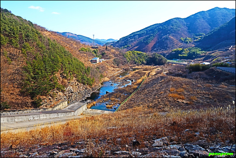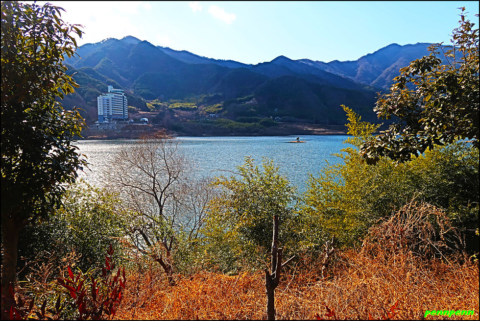 댐 하부에는 태양광발전소 및 소수력발전소가 있다고 합니다. 무엇보다도 댐에서 바라보는 하동호의 파란 물과 그 주변의 산과 능선이 정말 그림처럼 아름다운 풍경을 연출합니다. 하동호 서쪽에는 칠성봉(906m), 북서쪽에는 깃대봉(983m)이 있는데 사진 상으로는 분간을 잘 못하겠군요.