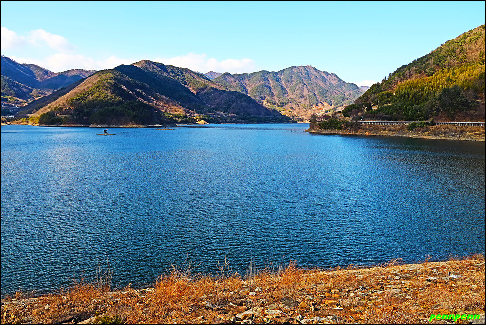 댐 끝에서 좌측으로 갑니다. 보행자 전용 데크길에서 바라보는 수문의 모습이 매우 특이하군요. 벤치가 있는 쉼터를 지나 북쪽으로 걷습니다. 호수 한가운데에 있는 2개의 작은 섬이 꼭 돛단배를 보는 듯 합니다.