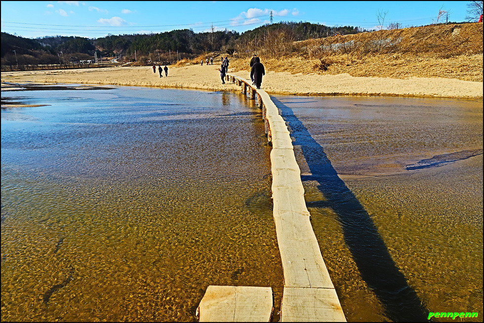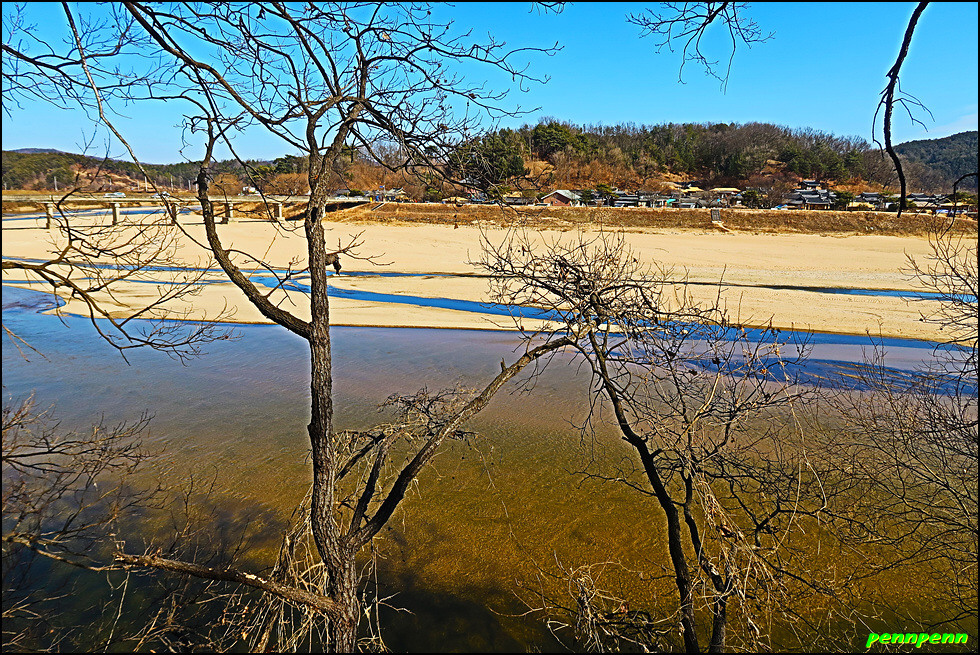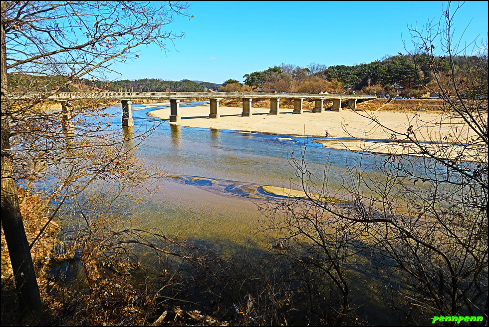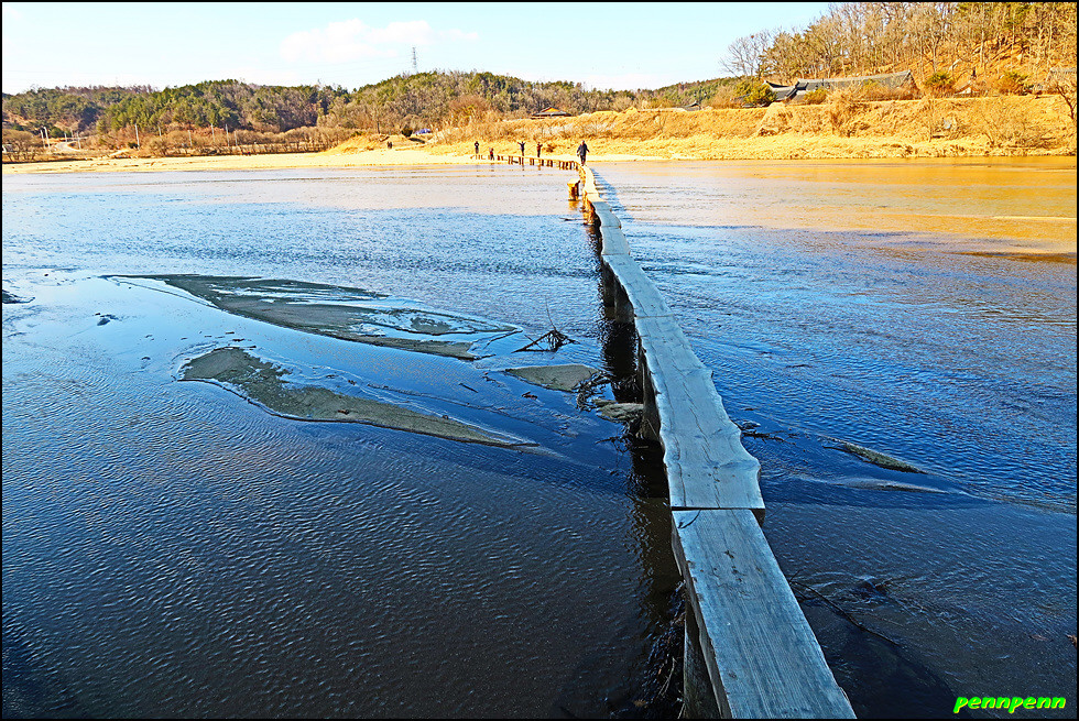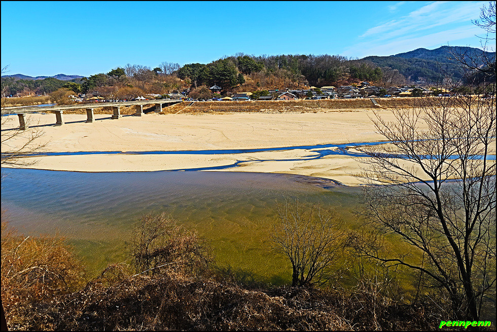 무섬마을로 진입하는 유일한 차도는 수도교(대형버스 진입불가)입니다. 수도교를 걸으며 바라본 내성천은 강폭은 넓지만 겨울철이어서 강바닥의 모래가 제법 보일정도입니다. 다리를 건너면 고색창연한 가옥들이 방문객을 막아주는데요. 먼저 무섬마을 둘레길부터 소개하겠습니다. 무섬마을 둘레길은 무섬자료전시관 및 전통한옥수련관 가까이에 있는 내성천의 제2외나무다리를 건너 마을 맞은편 야산을 경유해 무섬마을 중앙을 이어주는 외나무다리입구를 거쳐 보행데크를 이용해 수도교 서단까지 이어지는 길입니다.
