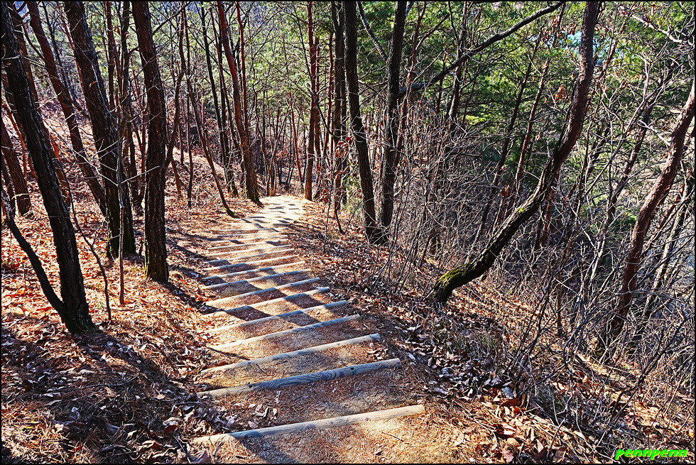 맞은편 언덕에 도착해 우측의 야산 속으로 들어섭니다. 강 옆의 언덕이라서 오르막이 매우 가파르지만 통나무계단을 잘 설치해놓아 안전하게 오릅니다. 의자가 놓여 있는 곳이 유일하게 무섬마을의 전경을 비교적 잘 볼 수 있는 조망대입니다. 잡목으로 인해 마을의 모습을 선명하게 볼 수 없음이 아쉽군요. 저 멀리 이름 모를 산의 능선도 보입니다.