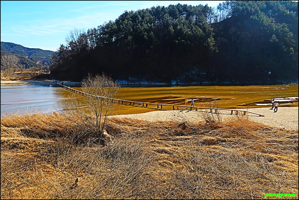 이제 야산을 내려섭니다. 가파를 나무계단을 내려와 뒤돌아보면 방금 지나온 야산이 그냥 언덕 같습니다. 강변에 도착해 좌측으로 가면 상당히 긴 외나무다리를 오가는 사람들의 모습이 즐거워 보입니다. 이곳에 있는 문수지맥트레킹 지도에는 무섬마을 둘레길을 표시해(노란 점선) 놓고 있습니다.