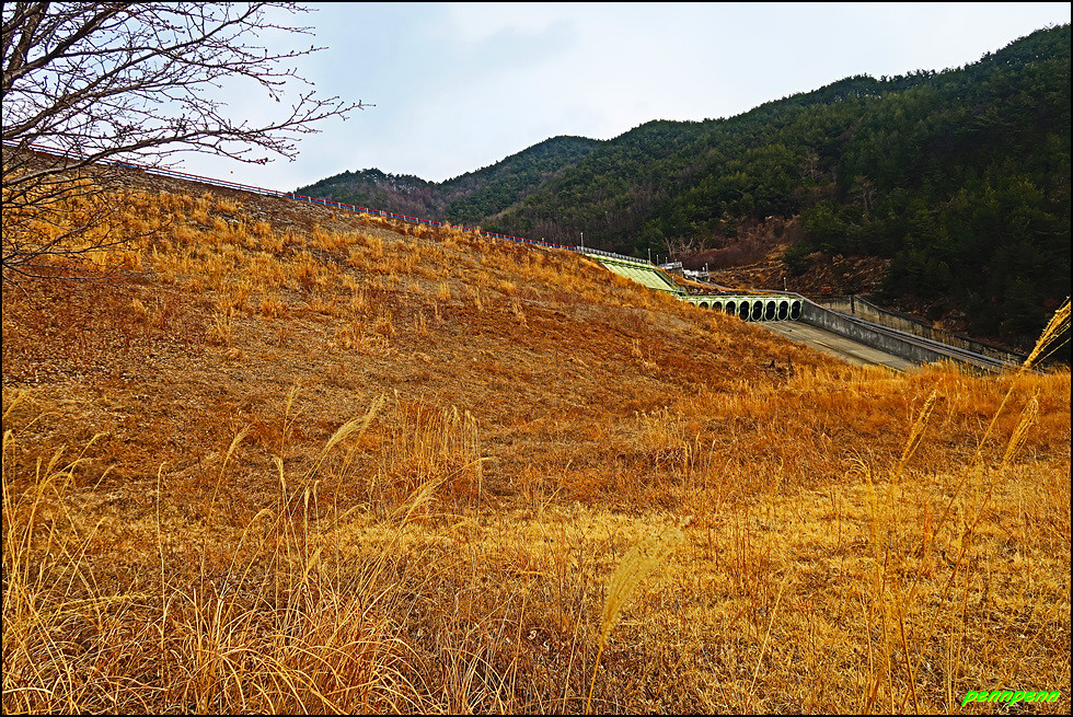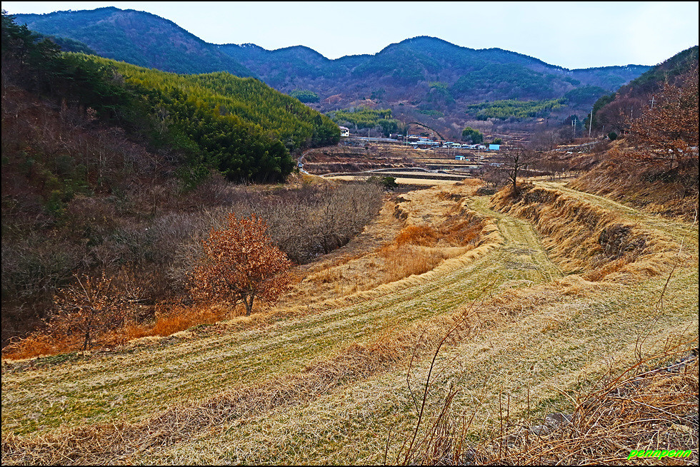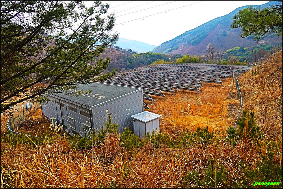 존티재를 내려서는 경사가 매우 가파르네요. 숲을 빠져 나오면 가야할 적량면 삼화실마을이 분지처럼 아늑하게 보입니다. 정자를 지나면 동촌마을인데, 이곳에는 효자 농작물인 부추와 취나물을 많을 재배한답니다. 언덕에 보이는 건축물은 한국조형예술원인데, 이는 국민대학교 목조디자인센터가 2007년 융합예술 특성화 교육기관인 한국조형예술원(KIAD)으로 전환하여, 자연융합예술 교육의 산실이 되었다고 합니다. 산촌마을에 이런 교육기관이 들어섰으니 참으로 대단하군요.