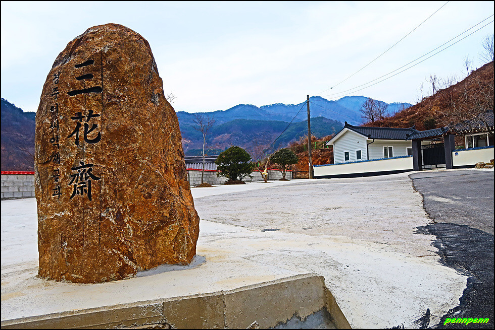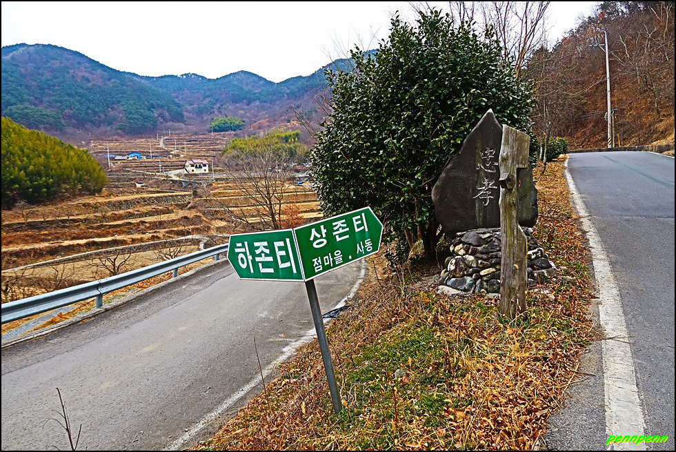소로를 따라가면서 명사마을 표석을 지나갑니다. 천하대장군과 지하여장군 돌장승이 길의 양쪽을 지키는 가운데 명호천에 걸린 명사교를 건넙니다. 도로 우측에 듬성듬성 민가가 나나타나더니 좌측으로는 매우 좁은 다랑논 뒤로 마을(하존티)이 보입니다. 이곳 명사마을은 돌배가 유명하군요. 1000년 된 돌배나무가 있는 명사마을은 하동군 녹색농촌체험마을로 지정되어 있다고 합니다.