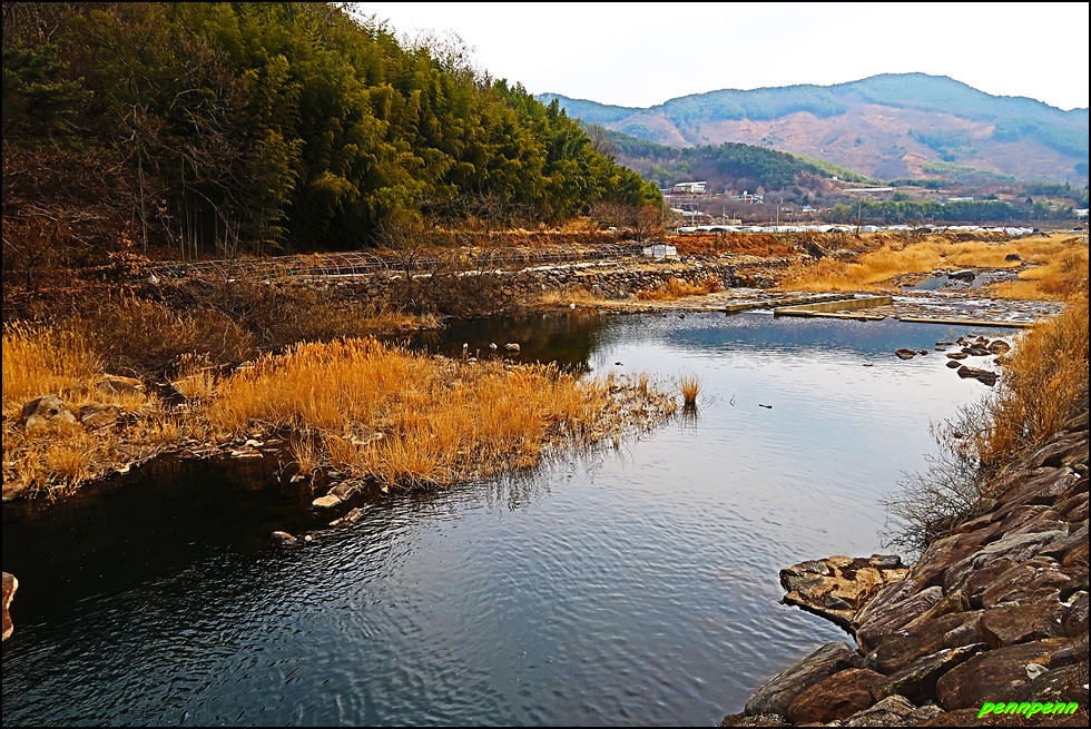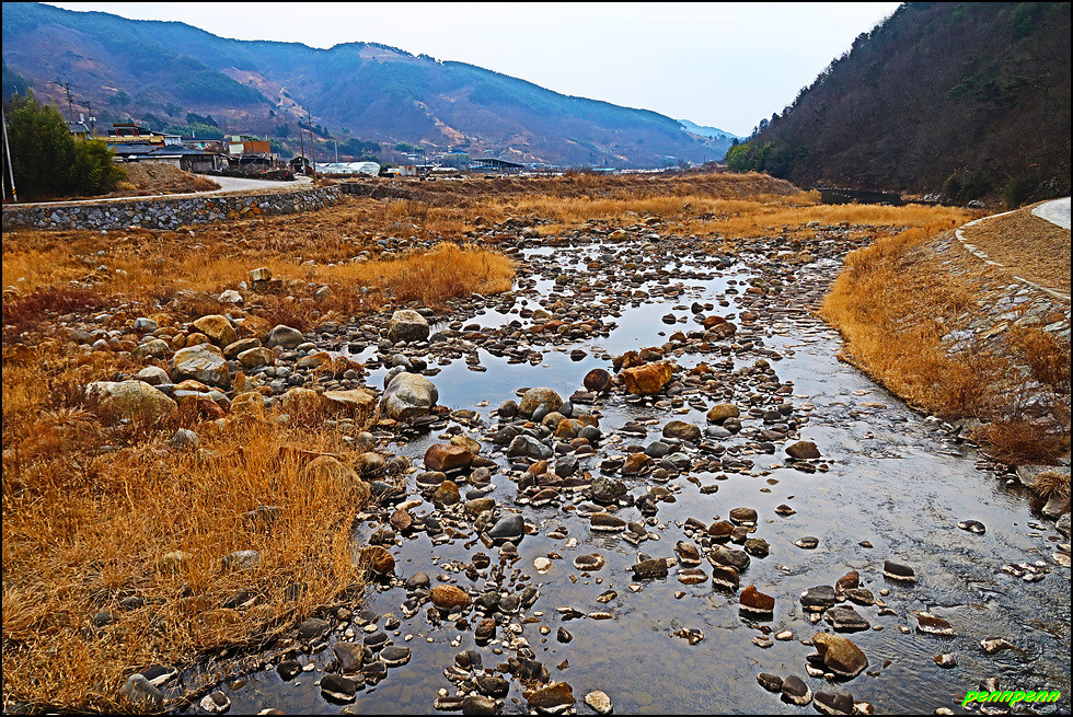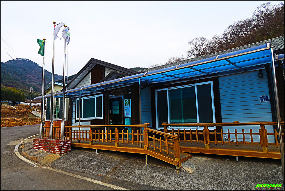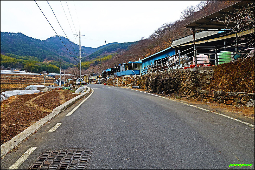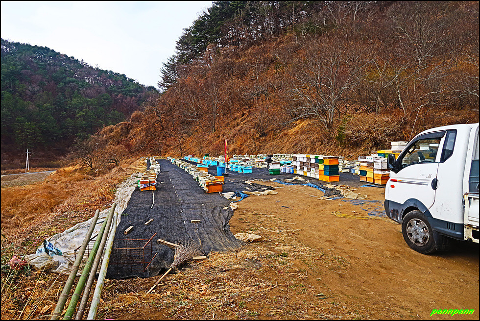 관점마을표석이 세워진 곳에서 도로를 버리고 우측으로 진입해 관점교를 건너갑니다. 관점교에서 북쪽으로 바라본 평촌마을은 벌써 저만치 멀어져 있군요. 장독대가 보이는 관점마을을 지나갑니다. 관점마을회관을 뒤로하고 작은 고개를 넘는데 내리막에는 매우 규모가 큰 양봉장이 있군요.